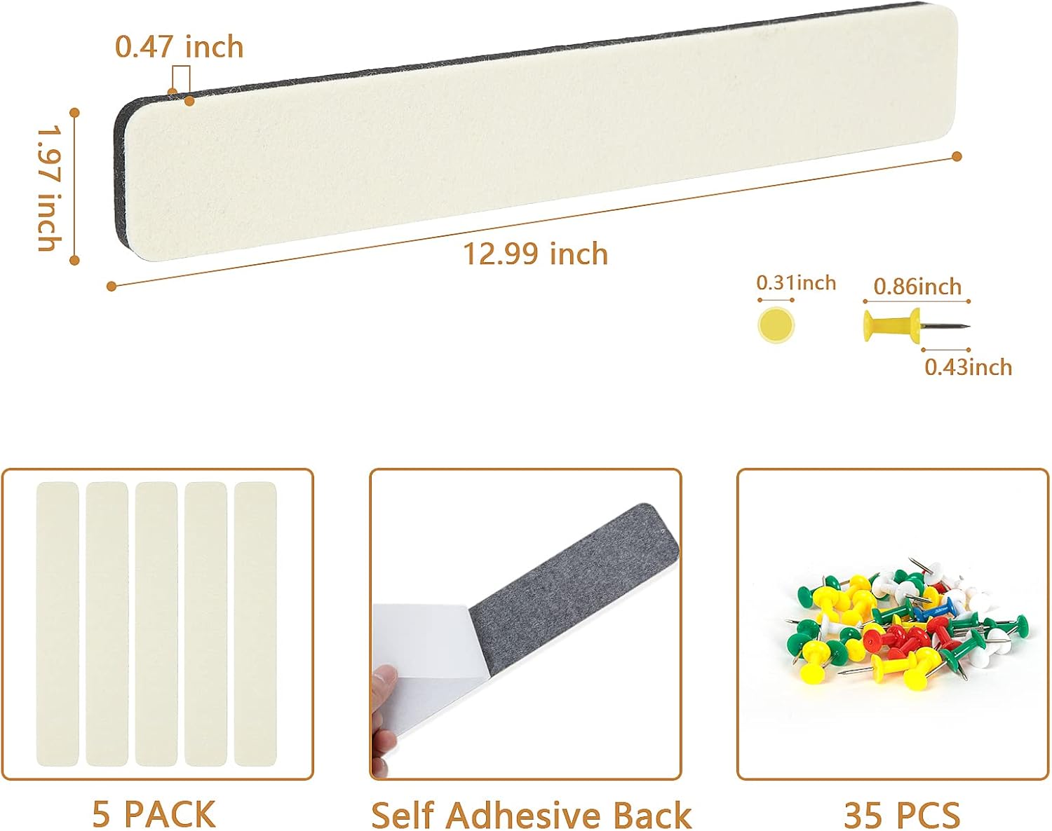 - 【Premium quality】 : Featured with superior felt material and adhesive design allows you to use the board strip more simple without drill hole. 12.99 x 1.97 inch for each boards and 35 push pins can meet your daily use.