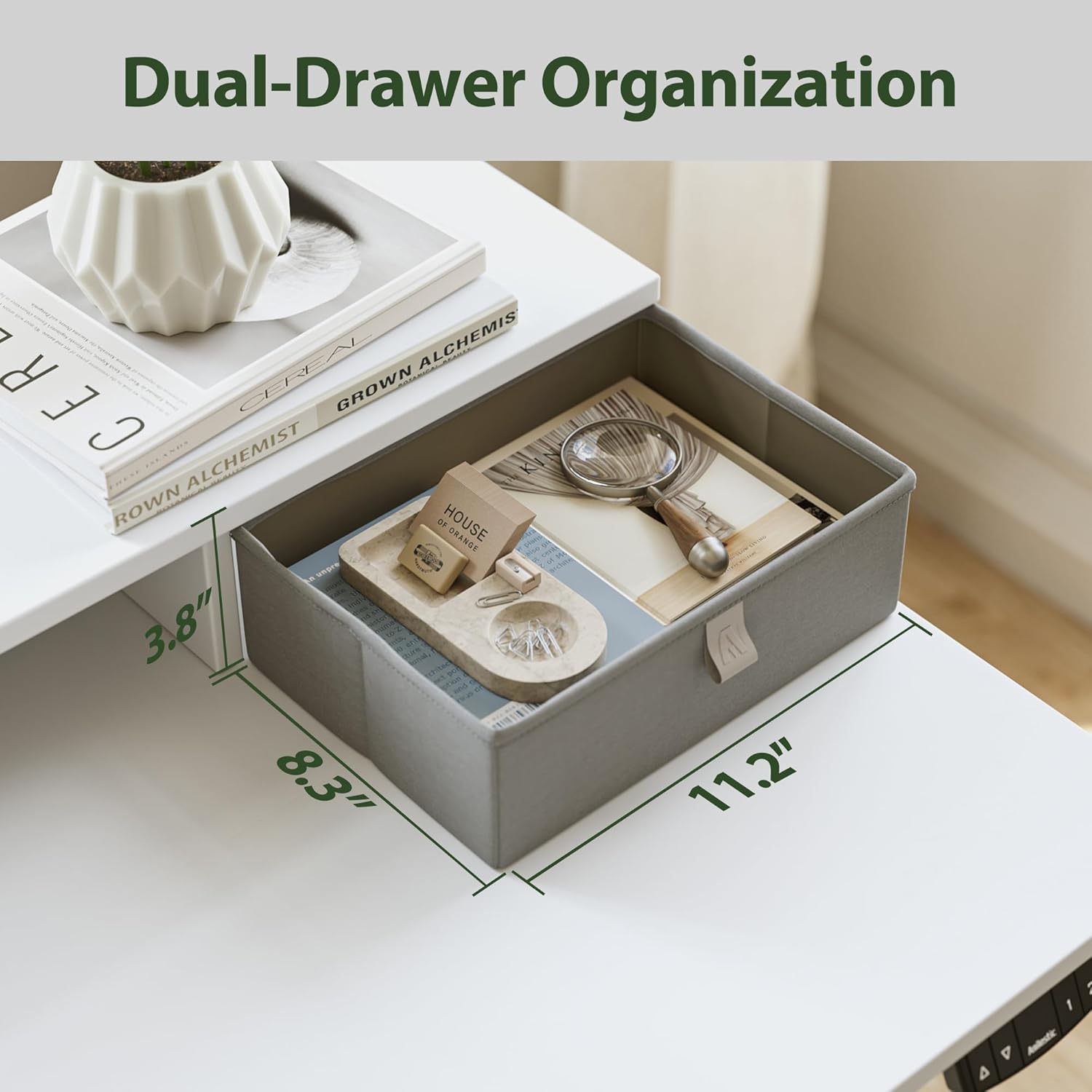 - 【Keyboard Tray & 2 Fabric Drawers】The 2 fabric drawers above the desktop can organize your clutter and keep the desktop clean and tidy at all times. This stand up desk comes with a slide-out keyboard tray to help you use your keyboard and mouse more ergonomically. The tabletop is made from low-VOC materials and meets federal and state safe air standards.