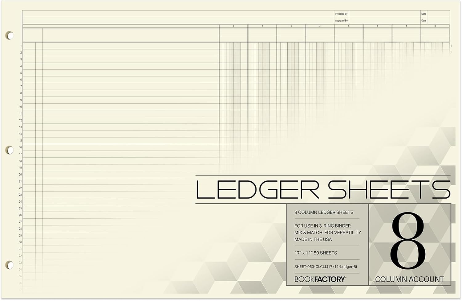 BookFactory Ledger Sheets/Large 8 Column Accounting Ledger Columnar (Eight Columns) Loose Leaf Paper - 17'' x 11'', 50 Pages, Loose Leaf, 3 Hole Punched (SHEET-050-CLCLL(17x11-Ledger-8)-AX)