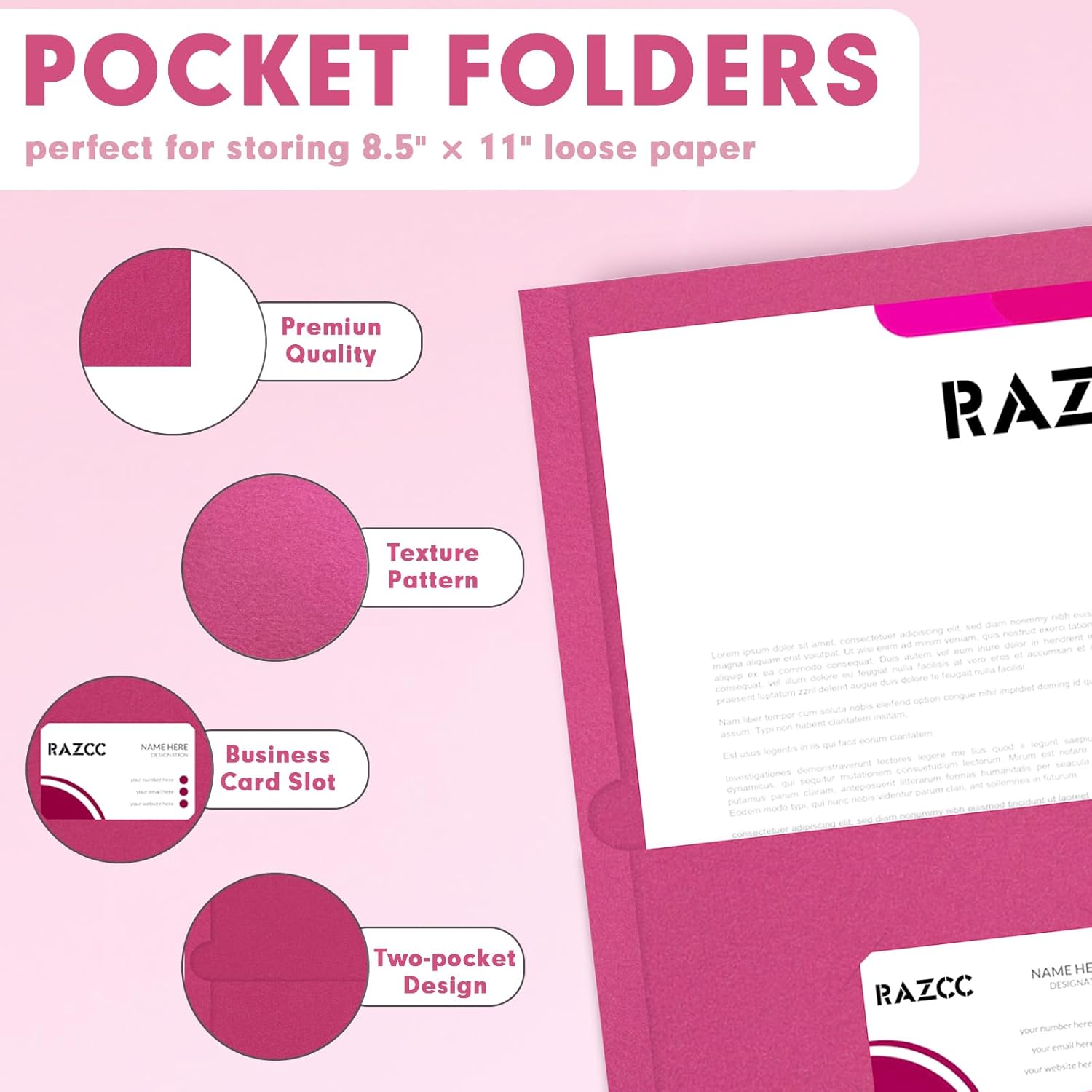 Two Pocket Folders, RAZCC 50 Pack 2 Pocket Folders Fit Letter Size Paper, Paper Folders with Pockets for School Office Business Home, Magenta