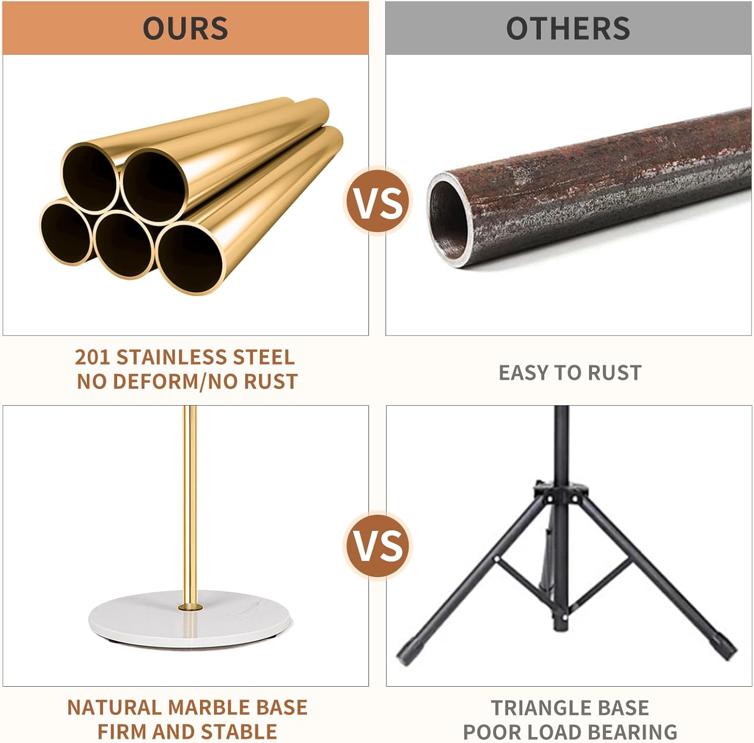 - VACUUM TITANIUM PLATING: The standing coat rack adopts advanced vacuum titanium plating technology. The coat rack is polished and sanded in multiple layers, and then vacuum titanium plating technology is used, using green materials, titanium layer is strong. The color of the coat rack is bright and smooth, no paint loss, no rust, no odor. This coat rack touch delicate, smooth, elegant modeling