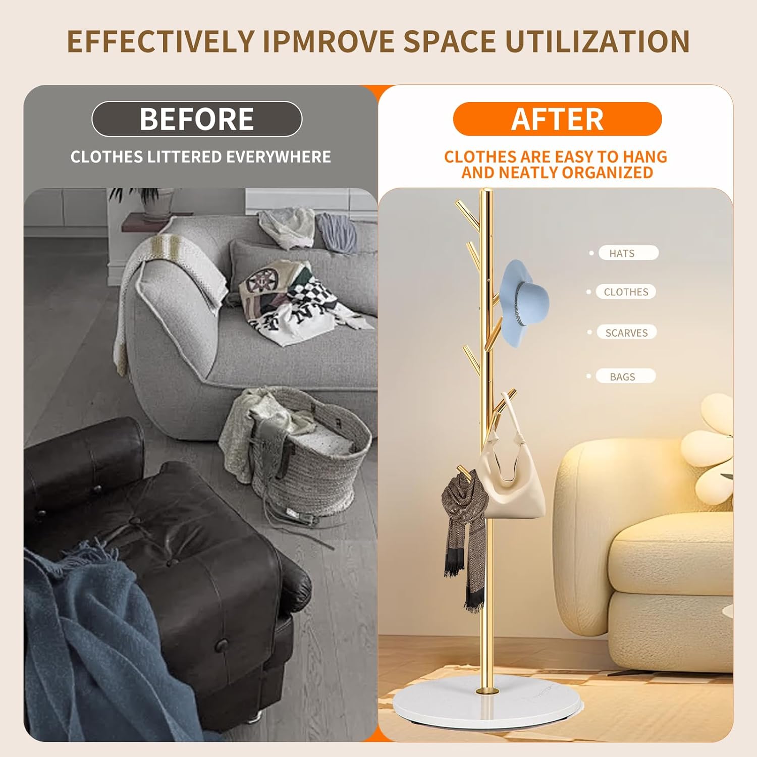 Coat Rack Stand with Natural Marble Base, Metal Freestanding Coat Rack, Modern Golden Coat Racks with 8 Hooks, Golden Standing Coat Hall Tree Hanger Stand for Scarf, Bag, Jacket