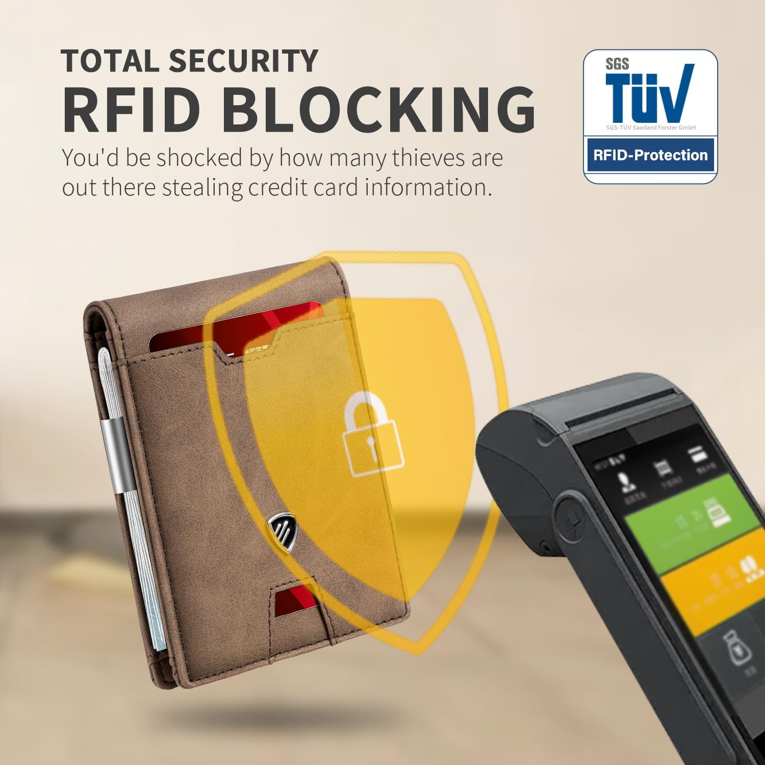 - RFID Blocking Protection - This rfid wallet for men is tested by an independent German quality control institute, specifically to block 13.56 MHz or higher RFID signals and protect against data theft by RFID scanners