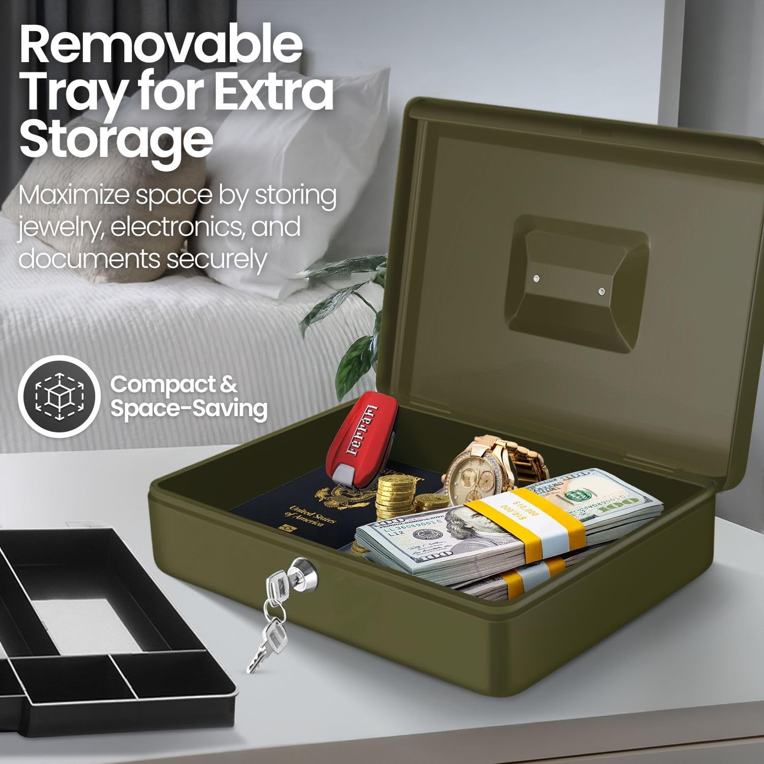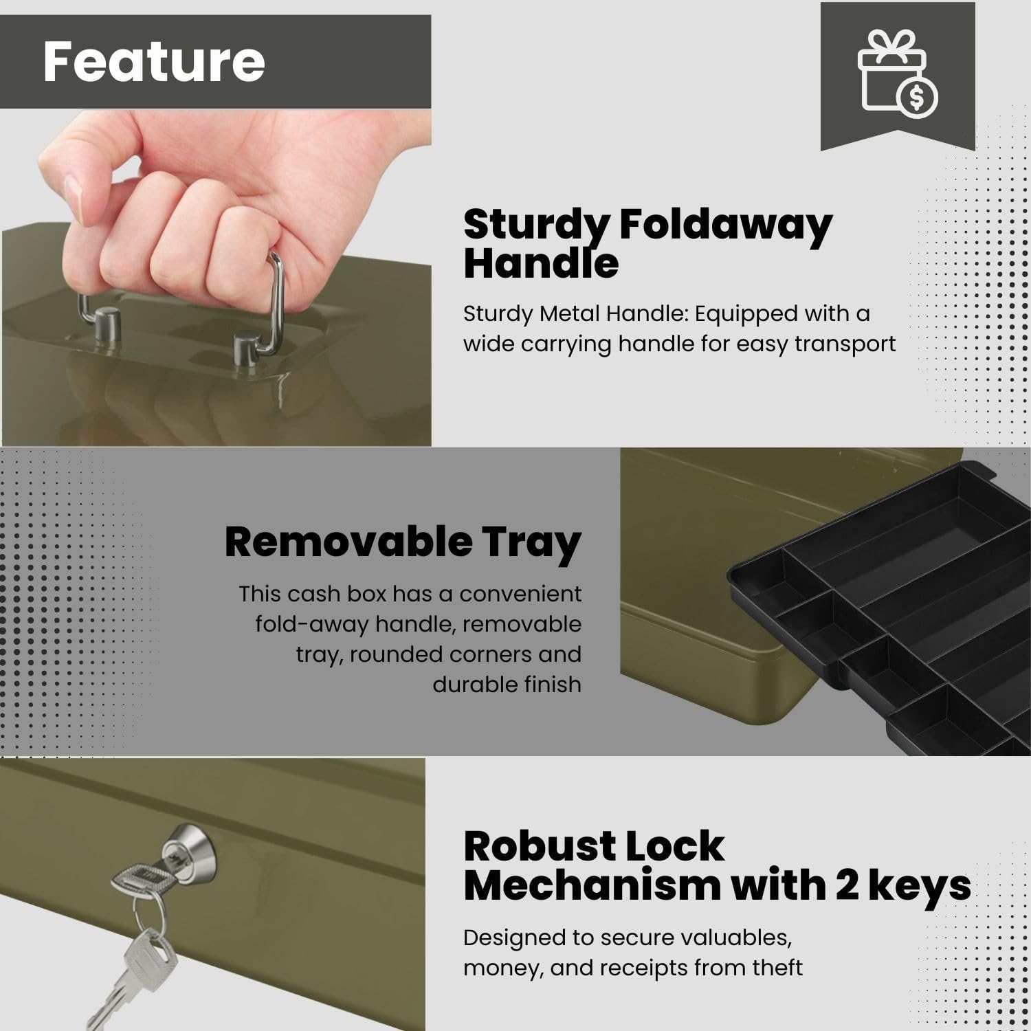 - Organize with Ease - Our money lock box for cash with key features 9 compartment trays to neatly arrange your bills, coins, checks, and other valuables, ensuring quick access and easy counting.
