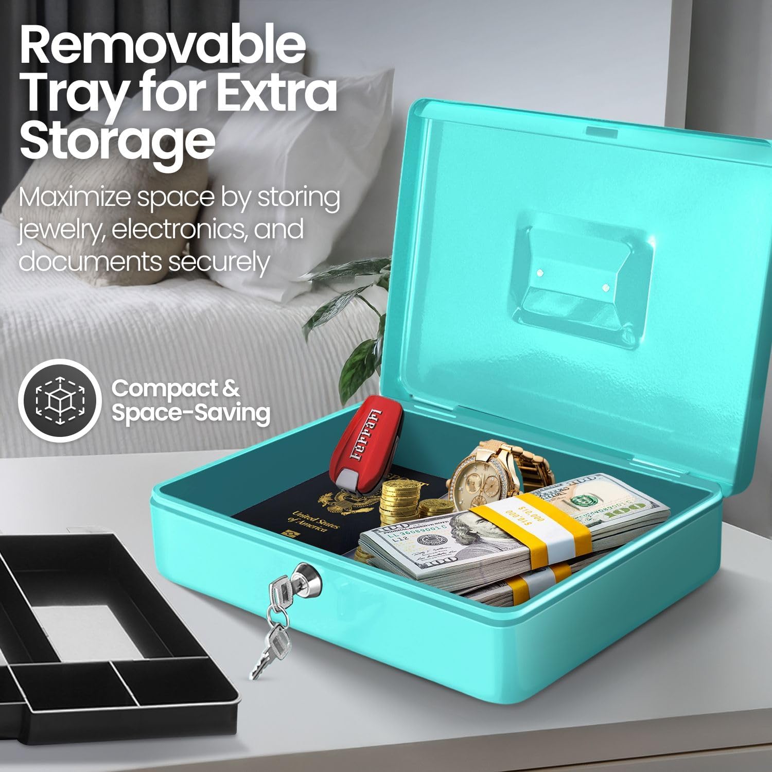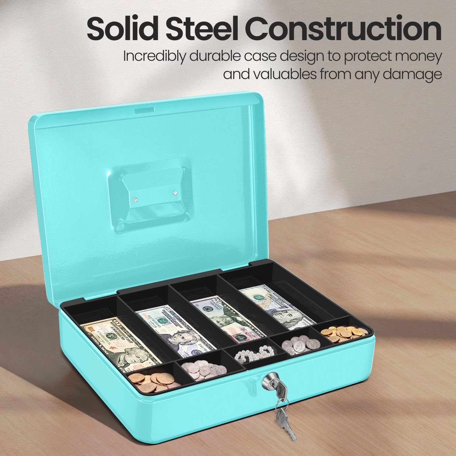 - Organize with Ease - Our money lock box for cash with key features 9 compartment trays to neatly arrange your bills, coins, checks, and other valuables, ensuring quick access and easy counting.