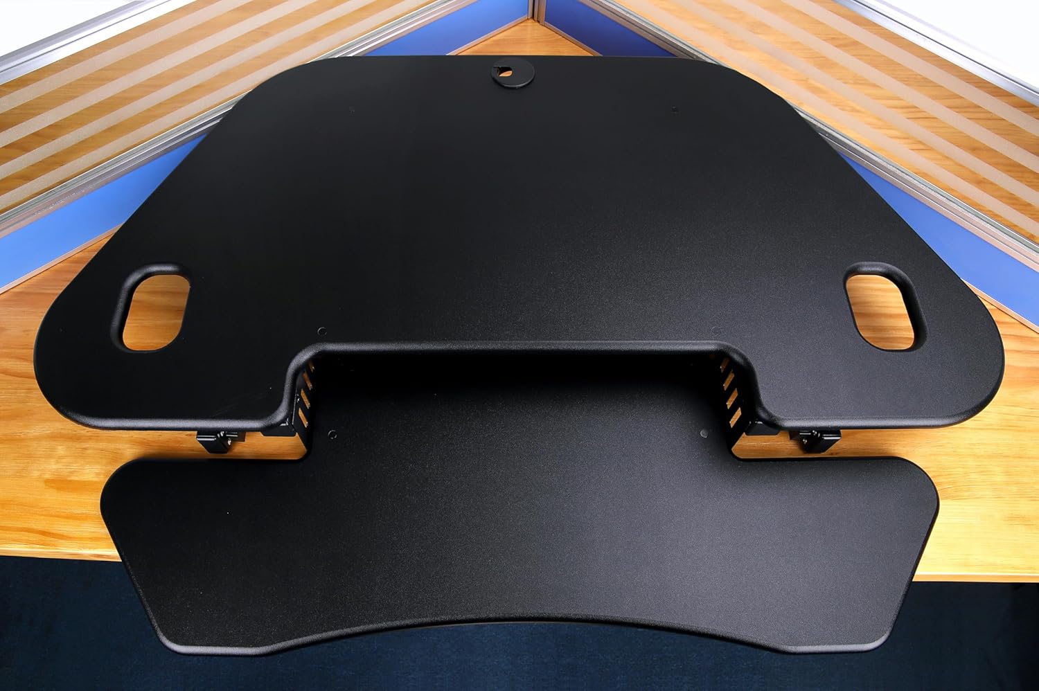 - Quick, easy and stable height adjustment: Sturdy metal frame with easy-grip side handle and gas piston assist, can raise and lower up to 40 pounds from 5" up to 18" above desktop. Straight up and down motion minimizes required depth (23.25").