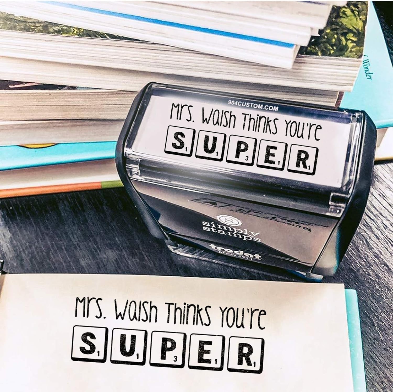 Custom Self-Inking Stamps | 49 Designs | Fun Phrases | Grading Made Easy | Classroom & Library Book Stamps (Super Tiles, Xtra Wide)