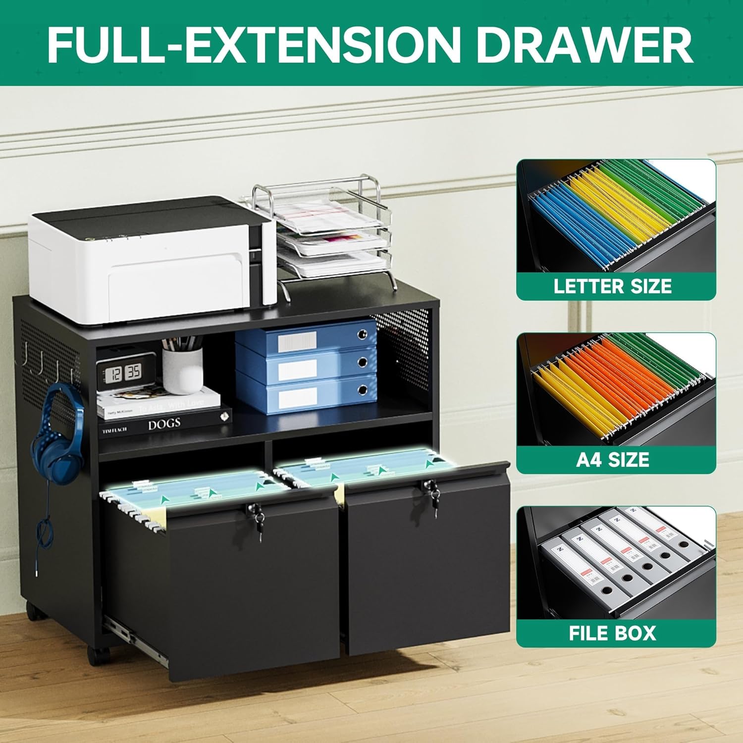 Letaya Mobile 2 Drawer File Cabinet with Lock, Metal Lateral Printer Stand Filing Storage Cabinets with Shelves for Home Office-A4/F4/Letter (Black)
