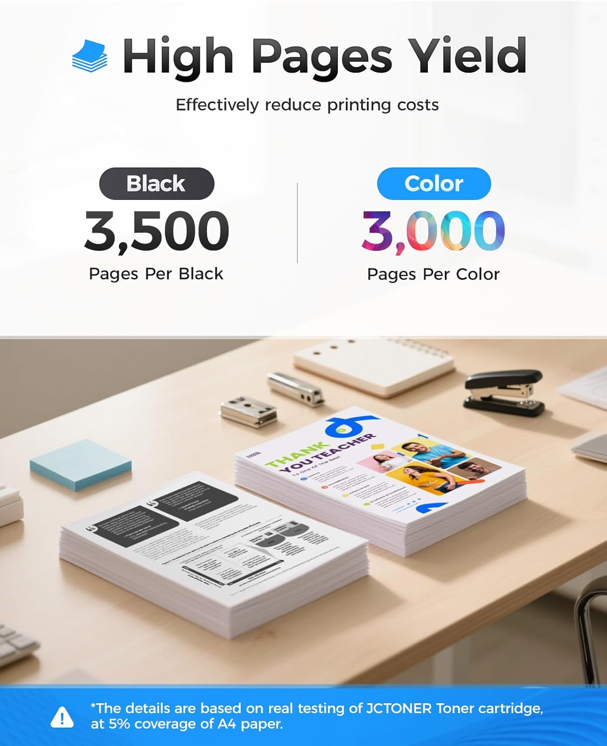- High Page Yield: 3,500 pages per black toner cartridges , 3,000 pages for each Cyan, Magenta, Yellow(5% coverage of A4 paper.