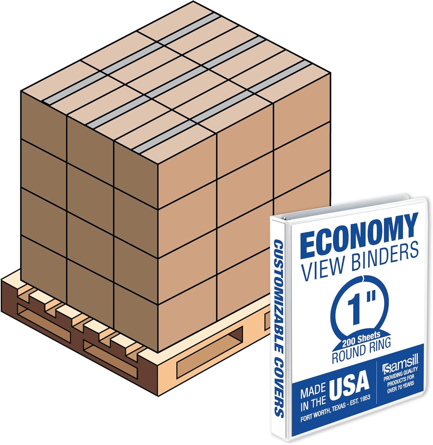 Samsill 1 Inch 3 Ring Binders, Made in USA, Economy Round Ring with Clear View Cover, 200 Sheet Capacity, White, Pallet of 864 Binders in 36 Cartons