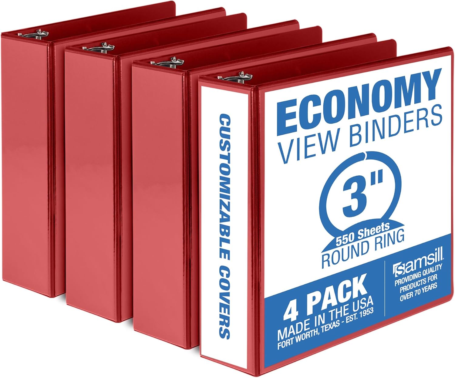 Samsill 3 Inch 3 Ring Binders, Made in USA, Economy Round Ring, Clear View Cover, 550 Sheet Capacity - for School, Home, Office - Red, 4 Pack