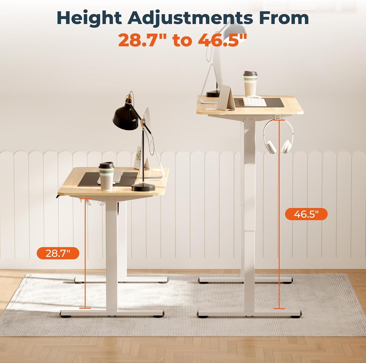 - Versatile Ergonomic Adjustment: Our stand up desk smoothly adjusts from 28.7" to 46.5", allowing for a comfortable transition between sitting and standing. This flexibility is essential for enhancing work productivity, health, and comfort throughout the day.