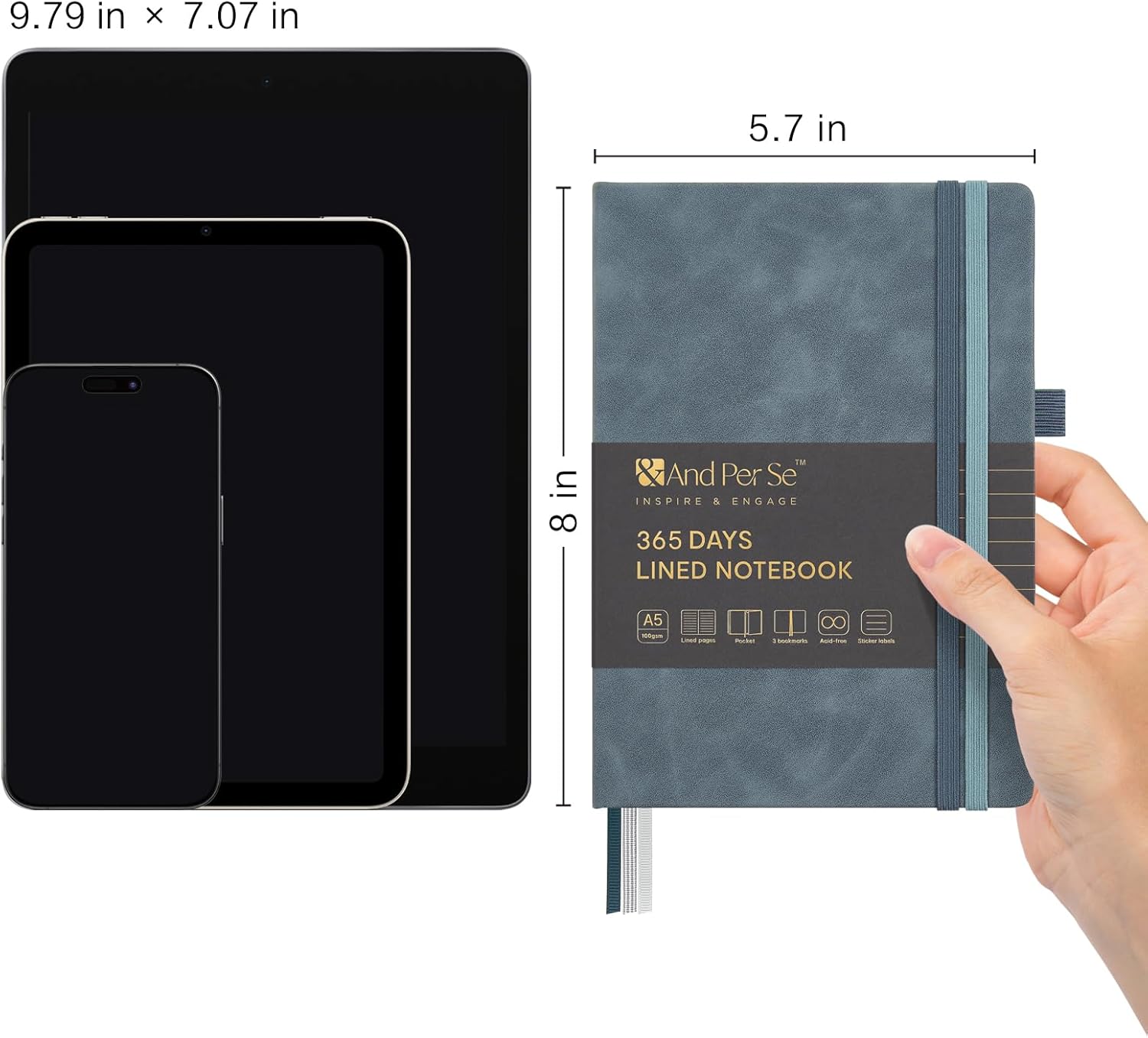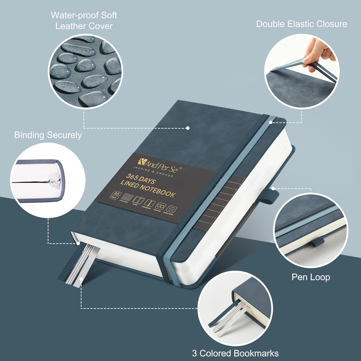 &And Per Se Lined Journal Notebook, 365 Pages, A5, 5.7'' x 8'' 100GSM Thick Paper, Journals for Writing, Hardcover Notebooks for Women Men (Blue)