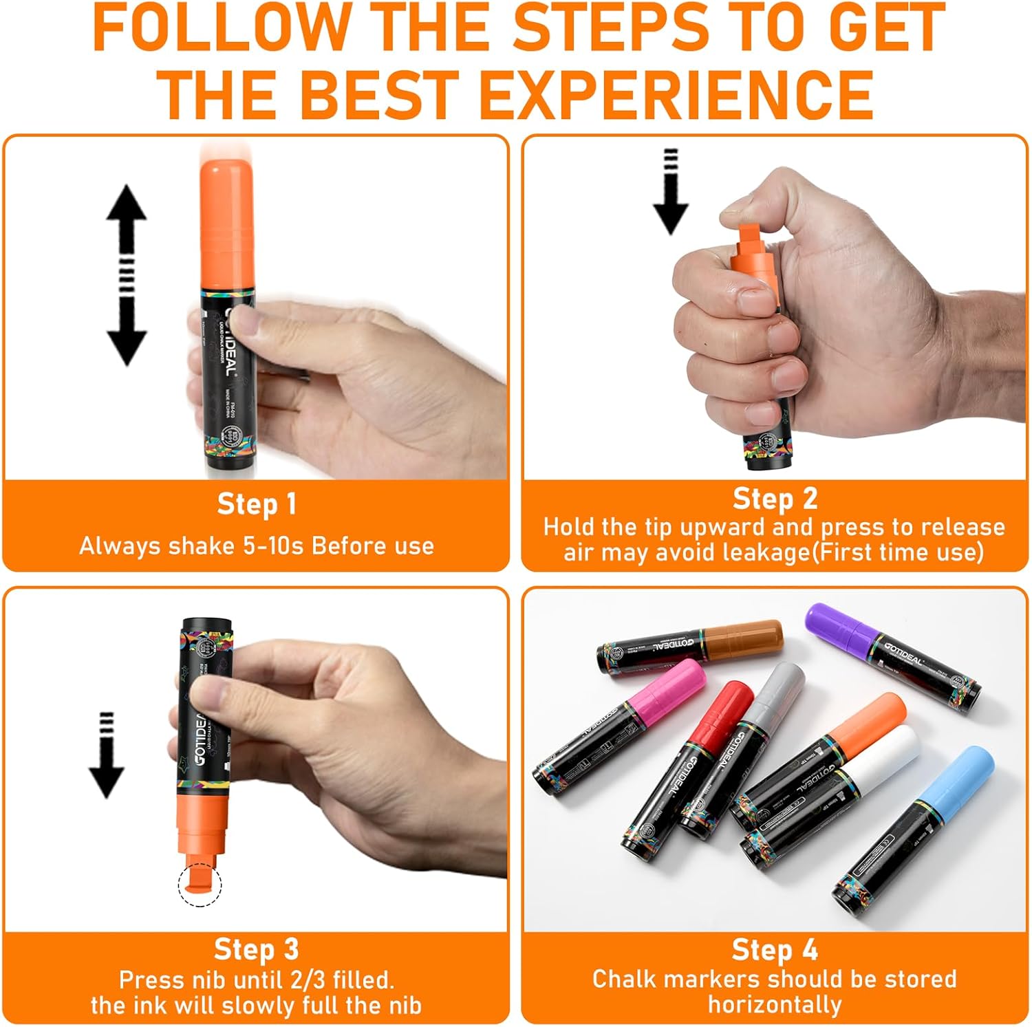 - 12 VIVID COLORS - GOTIDEAL Wide Tip Chalk Markers use new upgraded ink that brings more fluorescent colors to our customers.All colors are extremely pigmented, vibrant, and long lasting