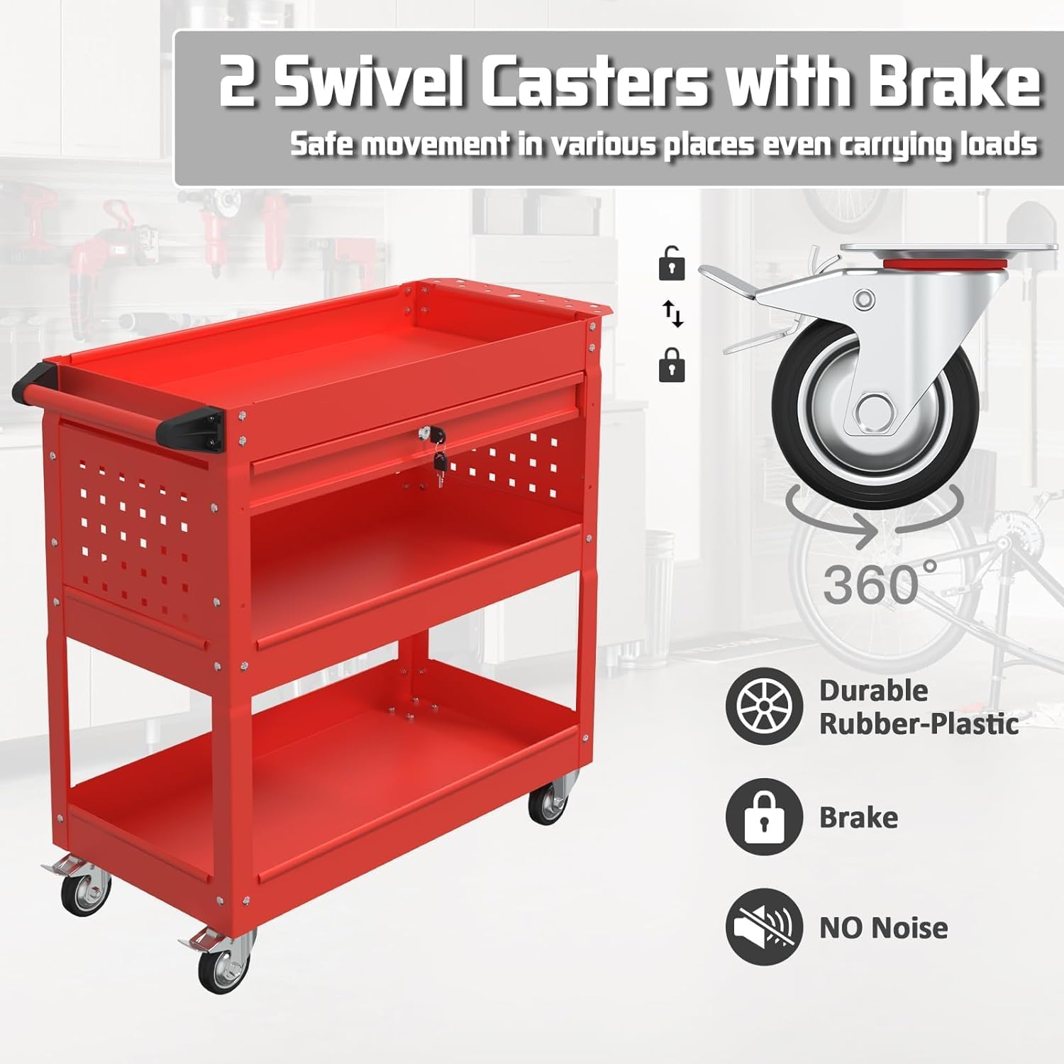 3 Tray Tool Cart with Drawers, 400 LBS Capacity Rolling Tool CartS on Wheels, Heavy Duty Utility Cart with Pegboard, Mechanic Tool Storage Cart for Garage, Warehouse and Repair Shop, Red