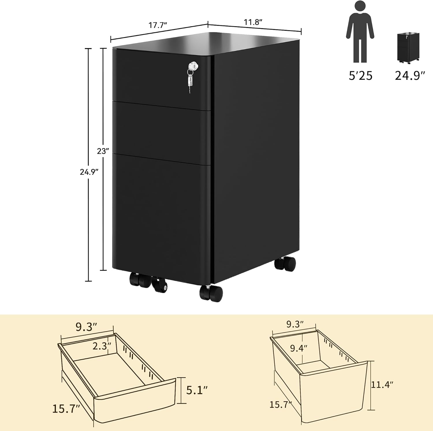 DWVO 3-Drawer Vertical File Cabinet, Mobile Filing Cabinet with Lockable, Pre-Assembled Compact Slim File Cabinet, Portable Office Storage for A4/Letter/Legal Documents (Black)