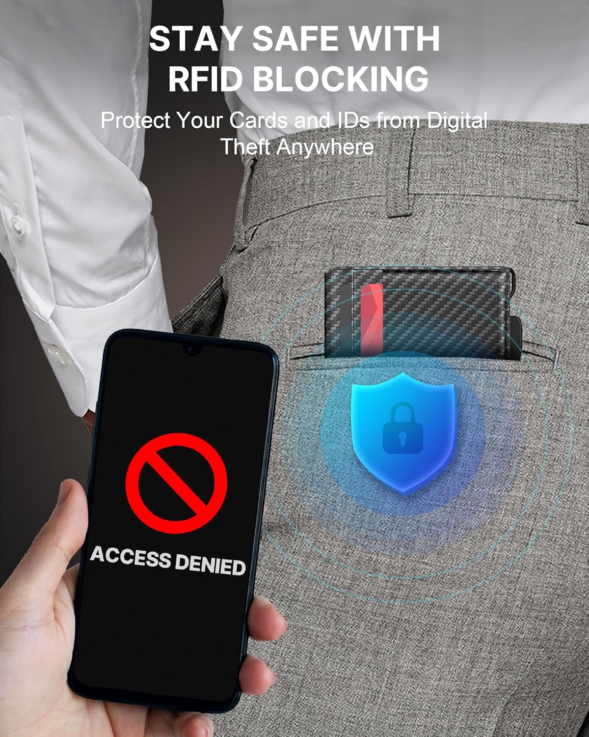 - RFID Protection: Protect your cards and personal information with advanced RFID blocking technology, effectively blocking the 13.56 MHz frequency. This ensures that your cards are protected from unauthorized scanning.