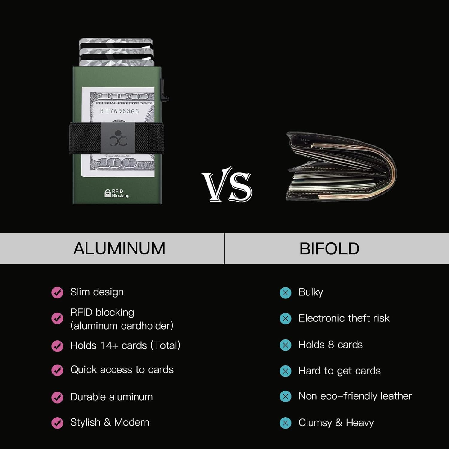- 💳 ULTRA THIN PROFILE: The Minimalist tactical wallet is very thin and can be carried comfortably in a front pocket. The aluminum cardholder size is 3.9*2.5*0.5in,weight only 2.6oz . And expandable backplate designed for additional storage. Ditch the bulk, less is more.