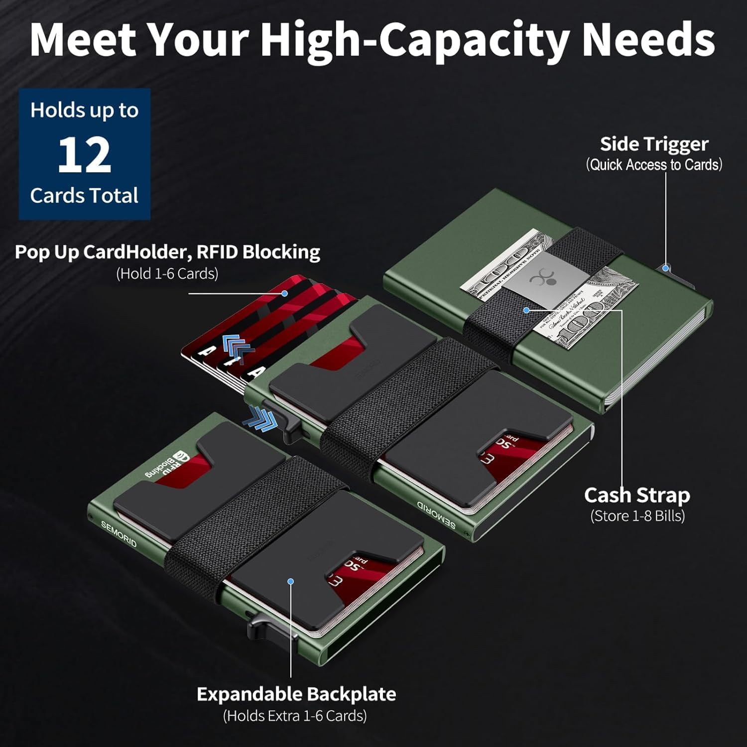 - 💳 QUICK ACCESS & LARGE CAPACITY HOLD UP 1-12 CARDS: Designed with enhanced enjection mechanism button to pop up cards quickly. The aluminum cardholder holds 4-6, depends on the number of embossed cards, and the expandable metal backplate holds 5-6 additional cards. The actual capacity depends on the card thickness.