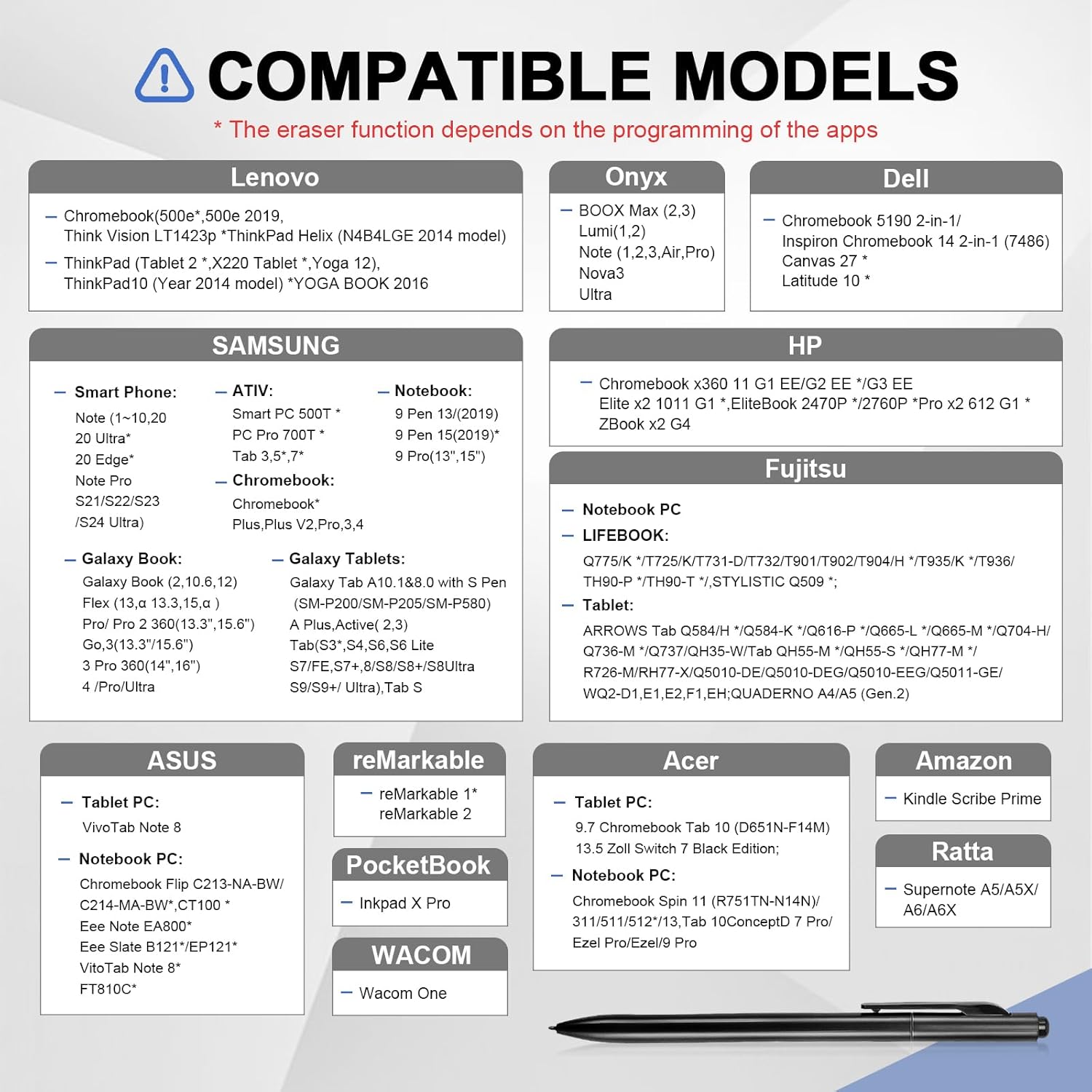 - Compatible Devices : reMarkable 1/ 2;Kindle Scribe Prime;Wacom One;Supernote A5/A5X/A6/A6X;Inkpad X Pro;BOOX Max (2,3),Lumi(1,2),Note (1,2,3,Air,Pro),Nova3,Ultra;Samsung Smart Phone:Note (1~10,20,20 Ultra*,20 Edge*,Note Pro,S21/S22/S23/S24 Ultra),Galaxy Tablets:Galaxy Tab A 10.1/8.0 (only S-Pen models),A Plus,Active( 2,3),Tab(S3*,S4,S6,S6 Lite,S7/FE,S7+,8/S8/S8+/S8Ultra,S9/S9+/ Ultra), reMarkable 1/ 2;Kindle Scribe Prime;Wacom One;Supernote A5/A5X/A6/A6X;Inkpad X Pro;BOOX Max (2,3),Lumi(1,2),Note (1,2,3,Air,Pro),Nova3,Ultra;Samsung Smart Phone:Note (1~10,20,20 Ultra*,20… See more