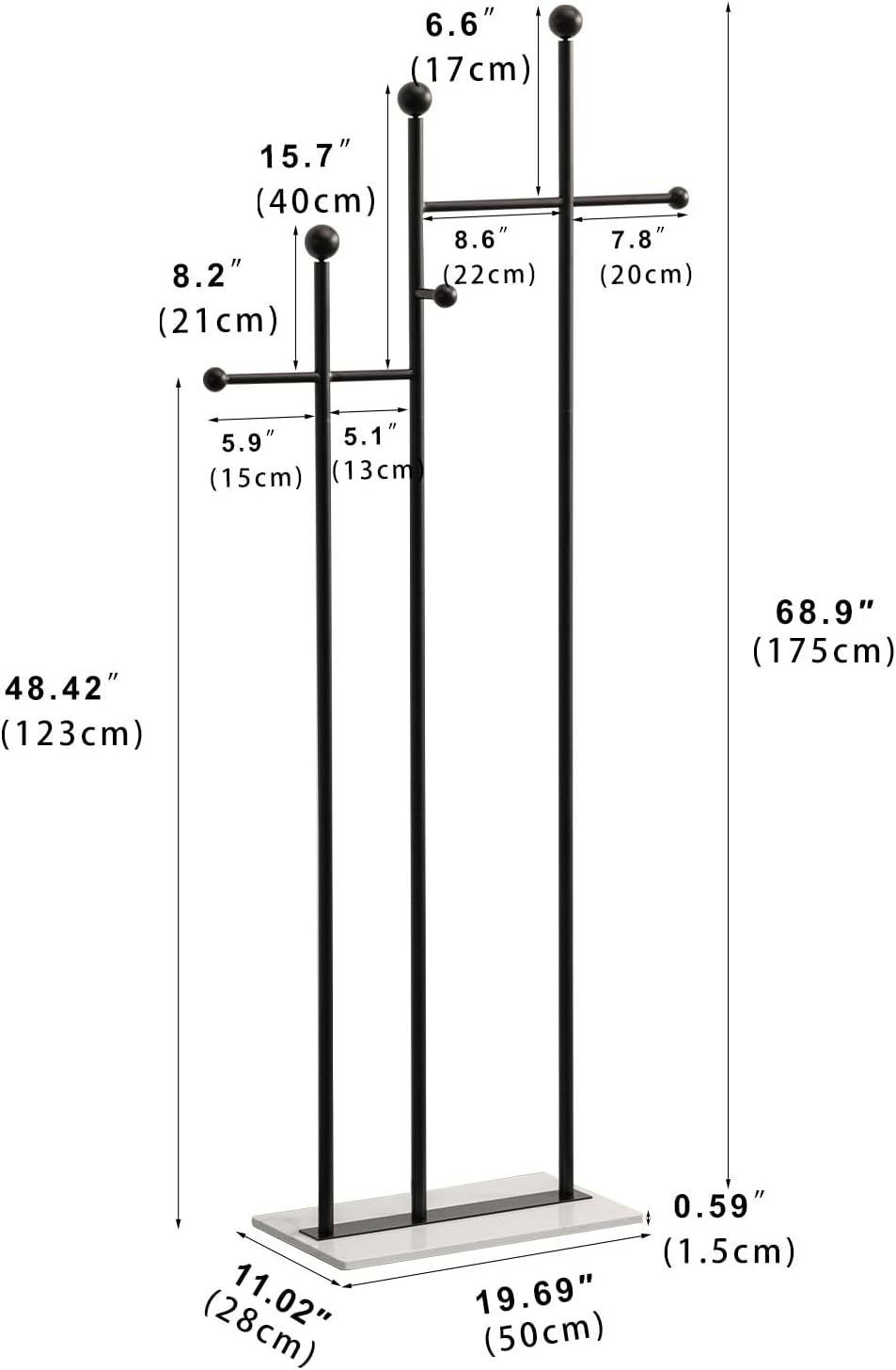 Standing Coat Rack with Marble Base Heavy Duty Clothes Hanger Rack Metal Coat Tree for Clothes Hats Scarfs Purses 19.69 x 11.02 x 68.9 Inches (Black)