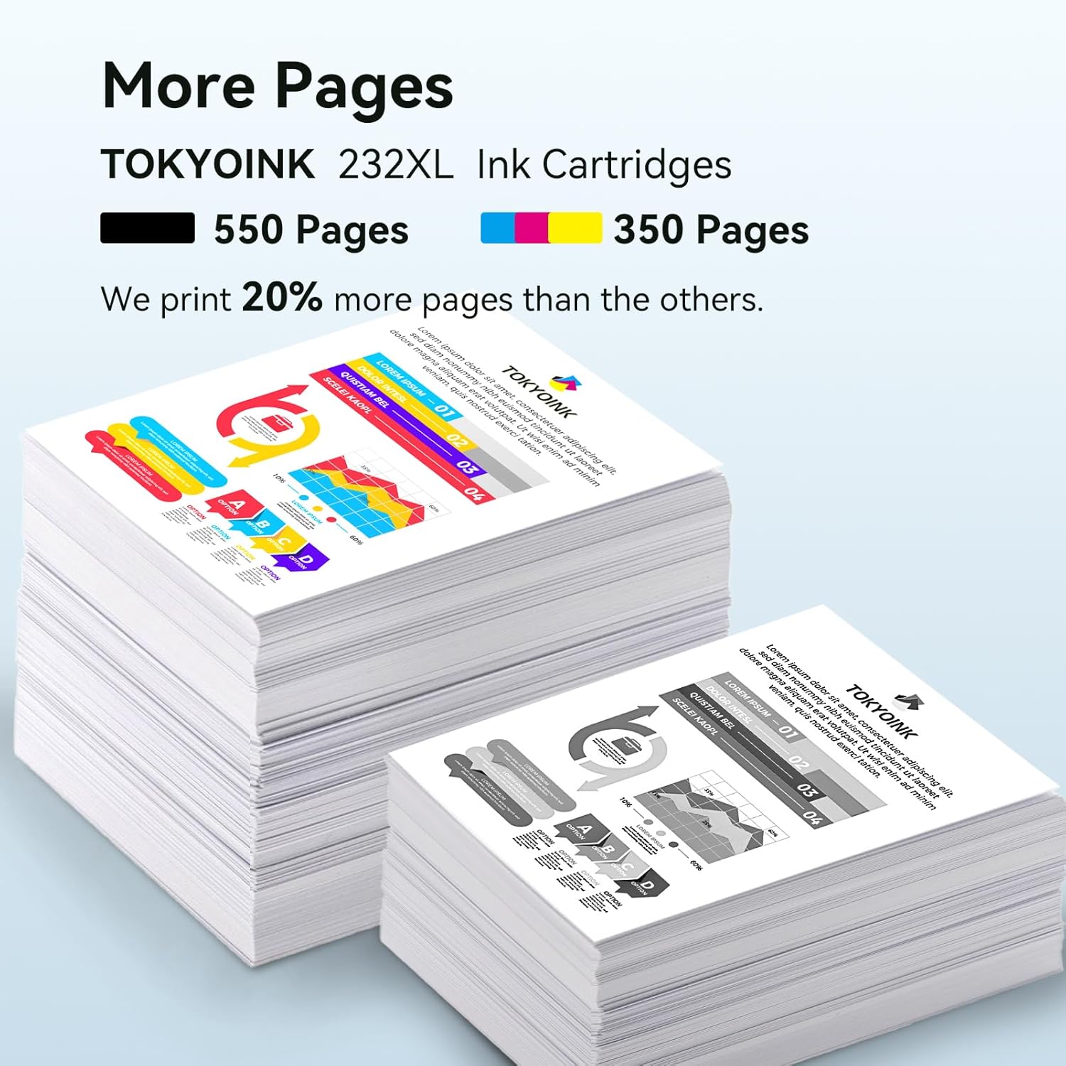 - TOKYOINK 232xl ink cartridges for printer High page yield with 550 pages printouts per 232XL black ink cartridge and 350 pages per 232XL color ink cartridges
