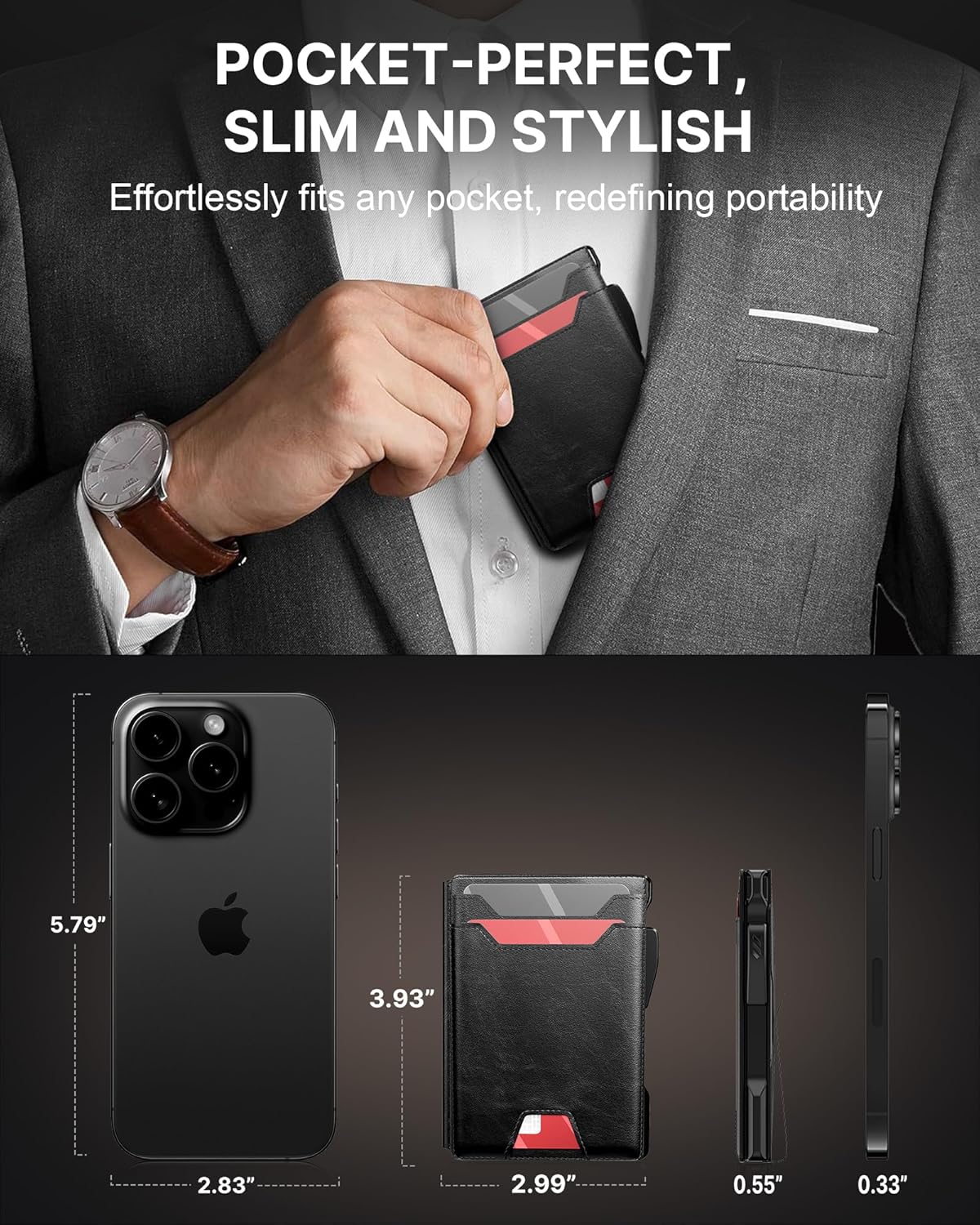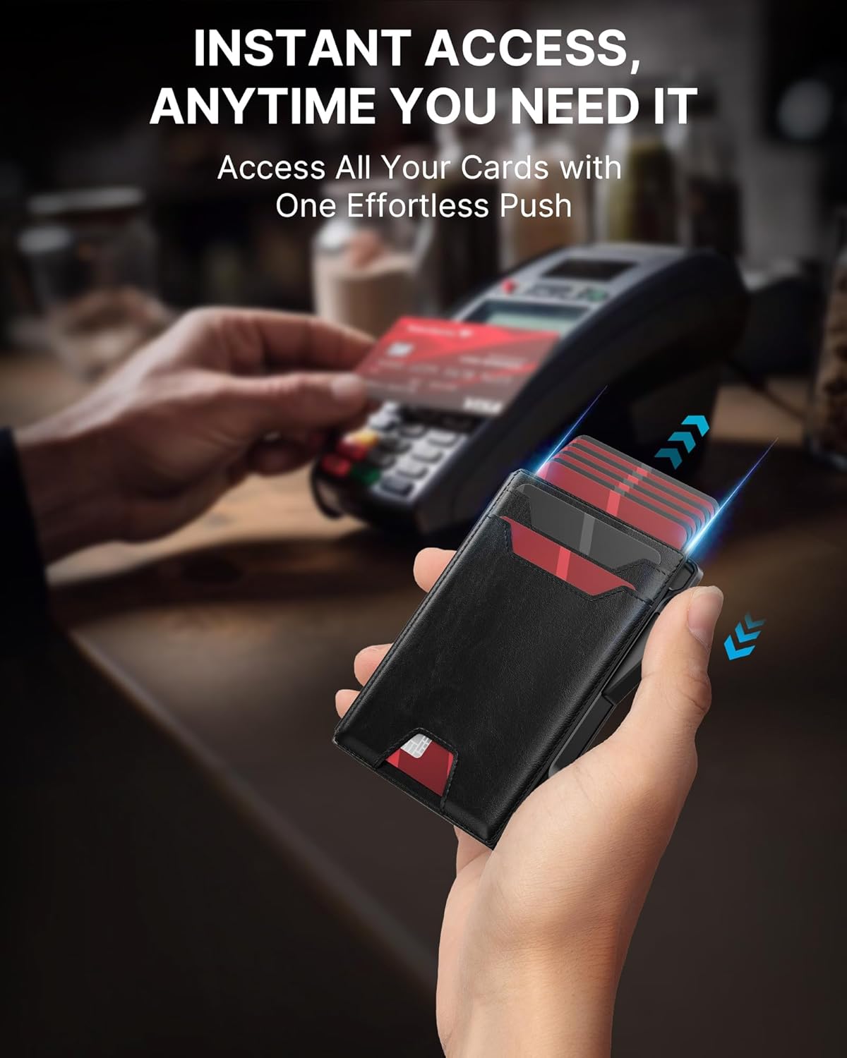 - Quick Card Access: Designed for speed, this wallet's smart pop up mechanism allows you to instantly view and select your cards. The front and back pocket provide 3 quick-release option for your frequently used card, ensuring they're always within reach.