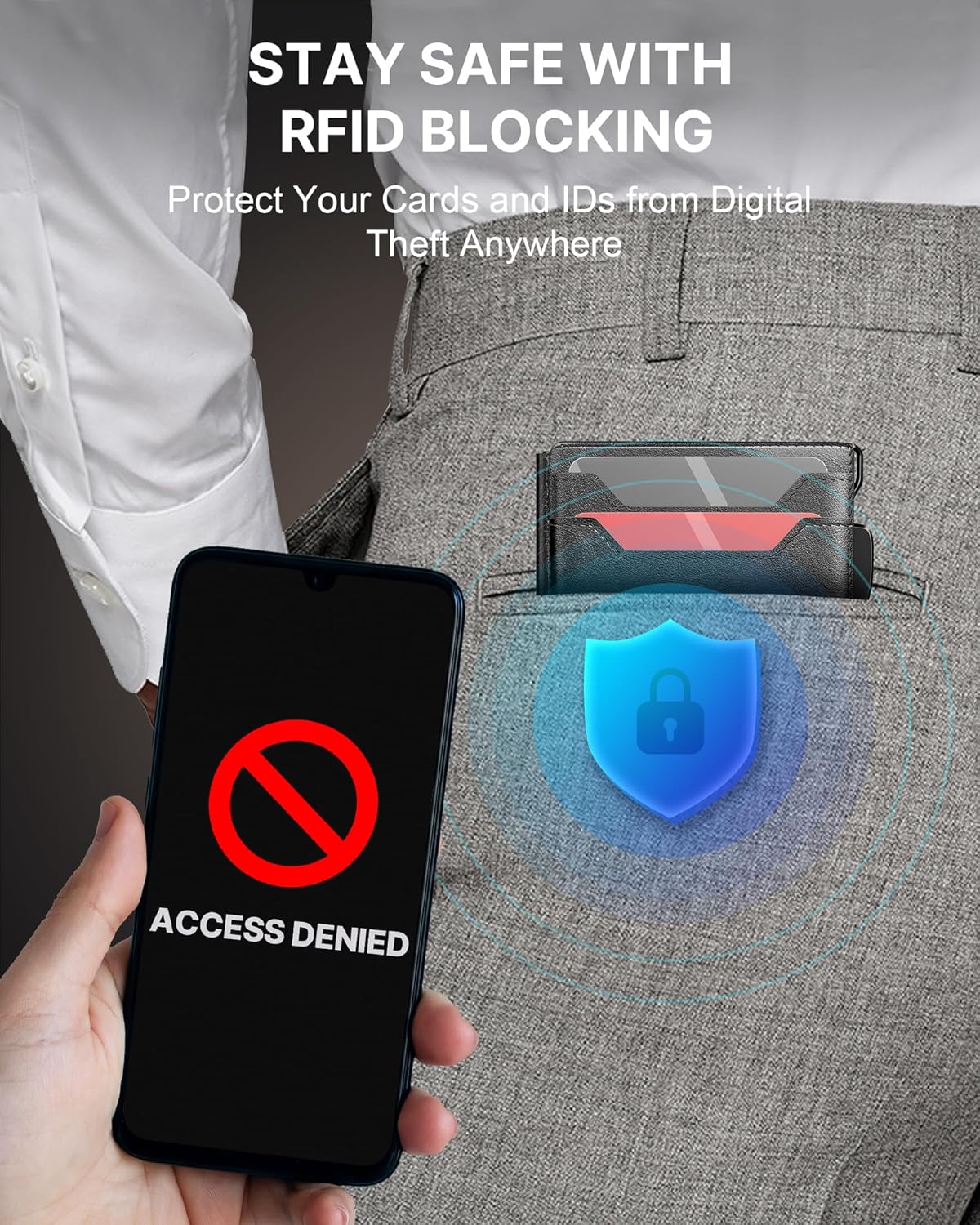 - RFID Protection: Protect your cards and personal information with advanced RFID blocking technology, effectively blocking the 13.56 MHz frequency. This ensures that your cards are protected from unauthorized scanning.