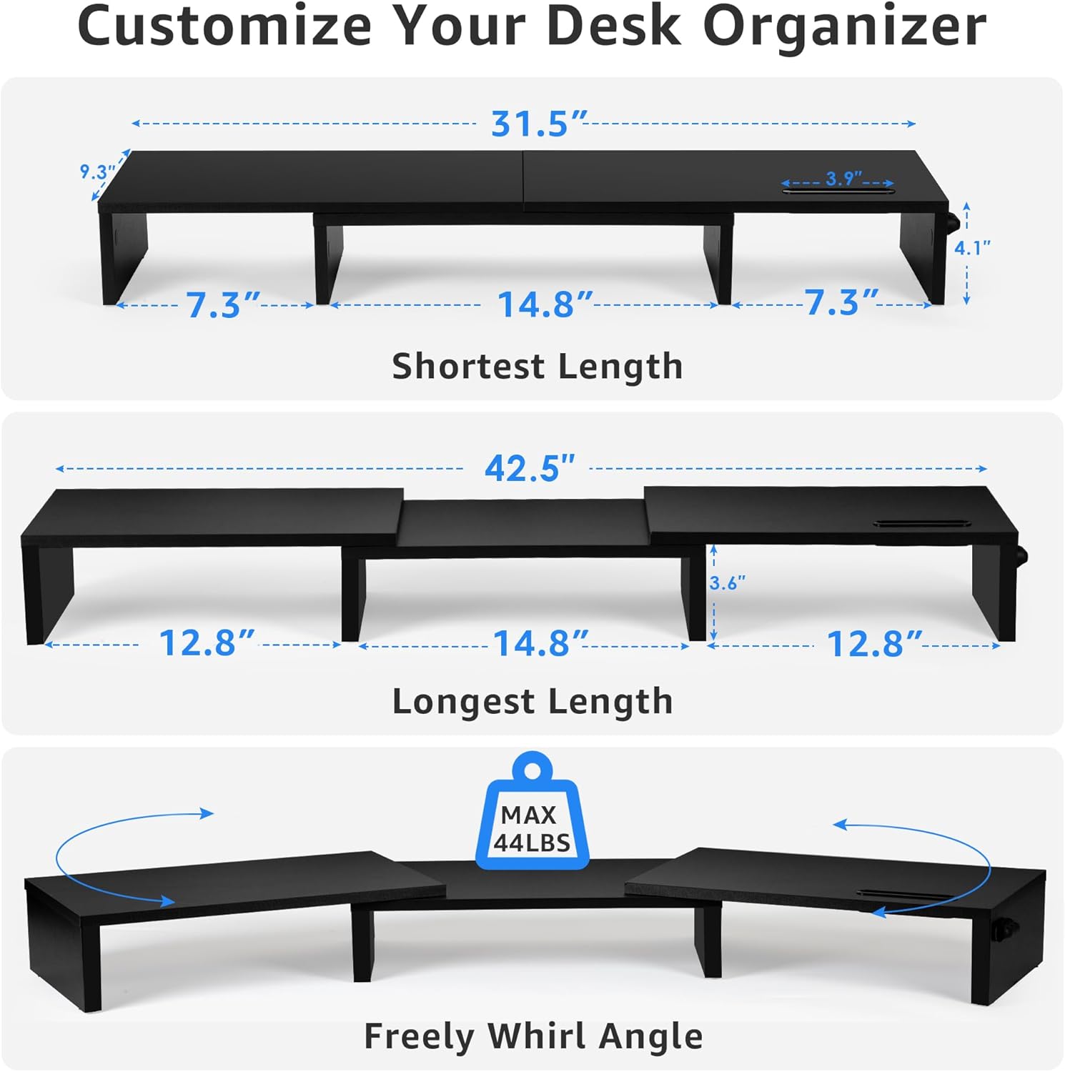 Dual Monitor Stand Riser for 2 Monitors, Monitor Stand for Desk, Adjustable Length & Swivel Angle Wooden Desktop Organizer Stand Riser with Smartphone Holder for PC Monitor Laptop, Black