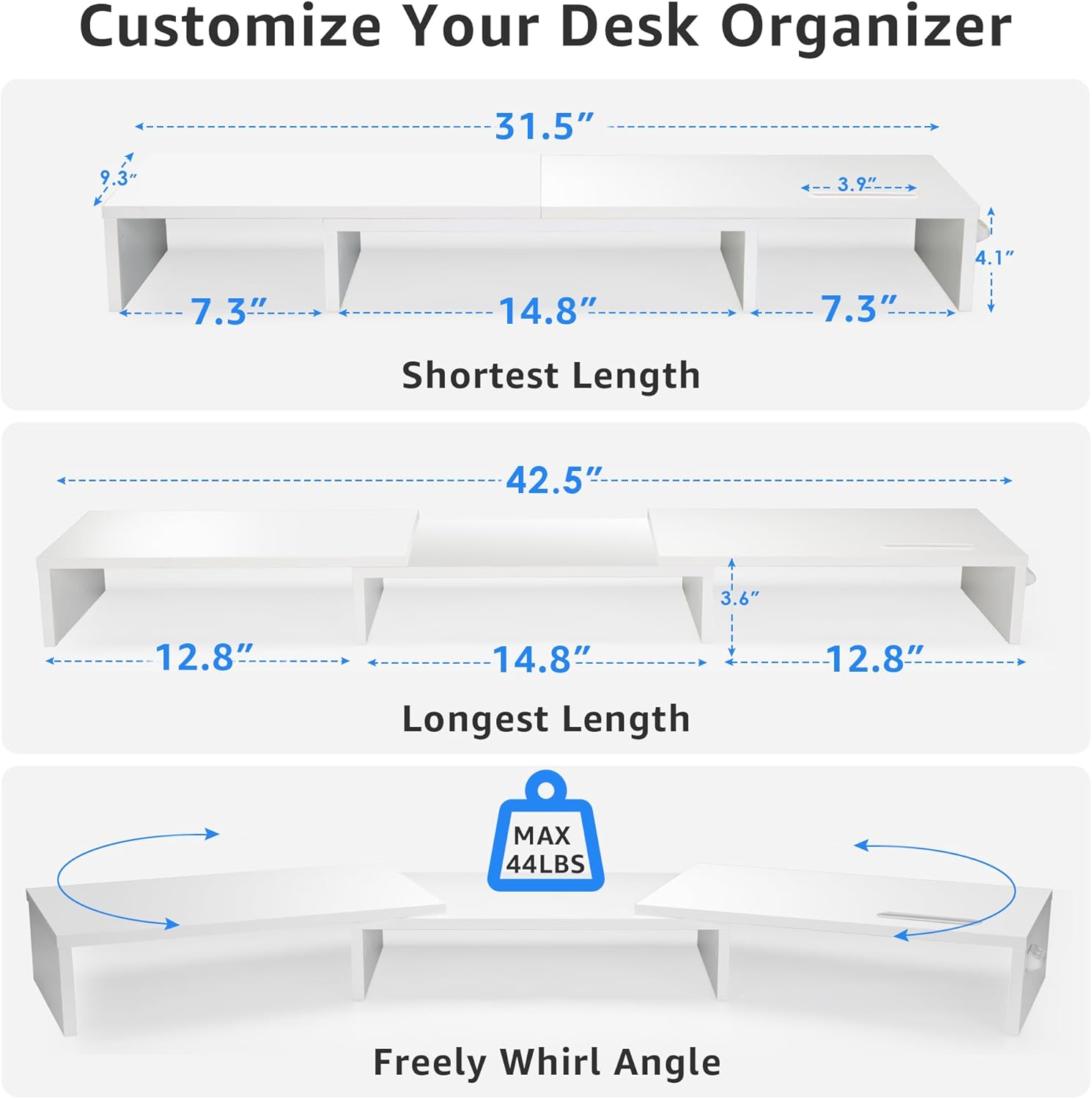 Dual Monitor Stand Riser for 2 Monitors, Monitor Stand for Desk, Adjustable Length & Swivel Angle Wooden Desktop Organizer Stand Riser with Smartphone Holder for PC Monitor Laptop, White