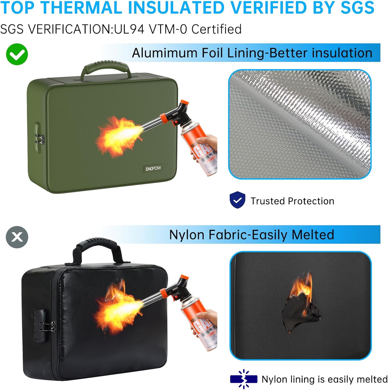 - Fireproof and Water-resistant: The multi-Layer file organizer is made of silicone coated material and aluminum foil which withstand the temperature up to 5200℉(double safe protection).Aluminum foil lining isn’t easily melt under high temperature after several tests. It has been passed by SGS TEST(UL94 VTM-0 Certified).The bag is fireproof and Water-resistant, which can effectively protect your important documents in a fire,flood,and wet weather. They will further keep your files intact