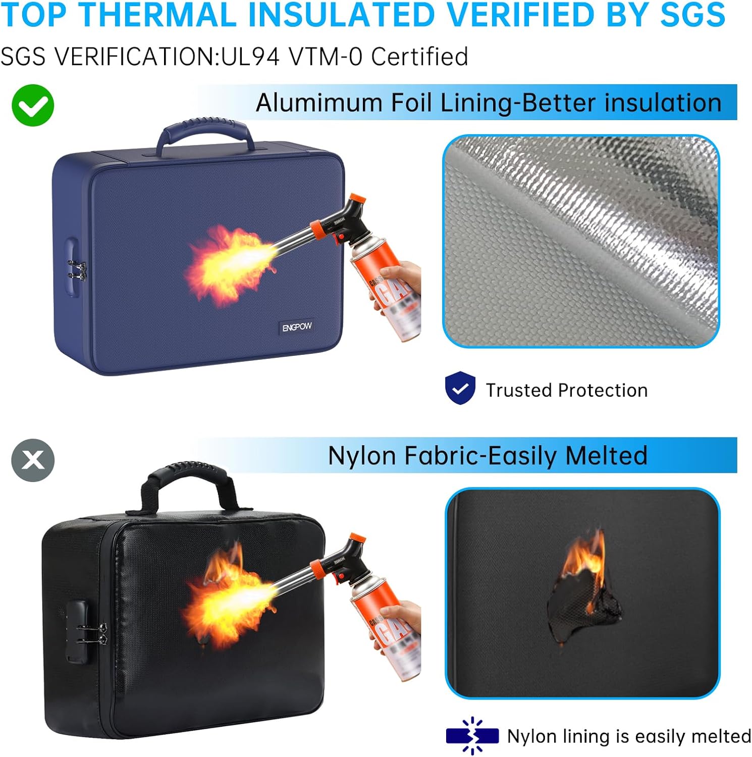 - Fireproof and Water-resistant: The multi-Layer file organizer is made of silicone coated material and aluminum foil which withstand the temperature up to 5200℉(double safe protection).Aluminum foil lining isn’t easily melt under high temperature after several tests. It has been passed by SGS TEST(UL94 VTM-0 Certified).The bag is fireproof and Water-resistant, which can effectively protect your important documents in a fire,flood,and wet weather. They will further keep your files intact