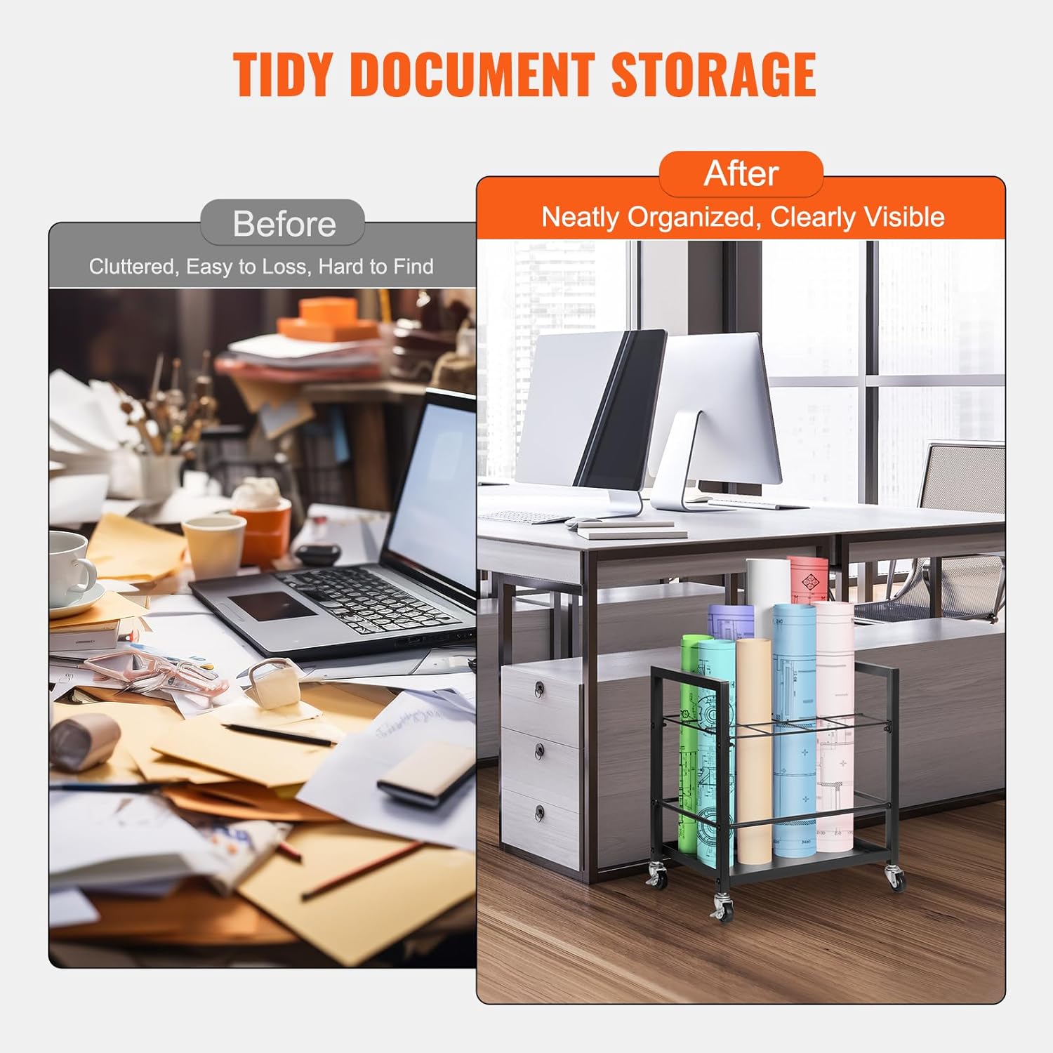 VEVOR Blueprint Storage Rack, 12 Slots Blueprint Holder with Wheels, Mobile Metal Storage Cart for Map Poster Architectural Construction Plan, Roll File Organizer for Home, Office, School