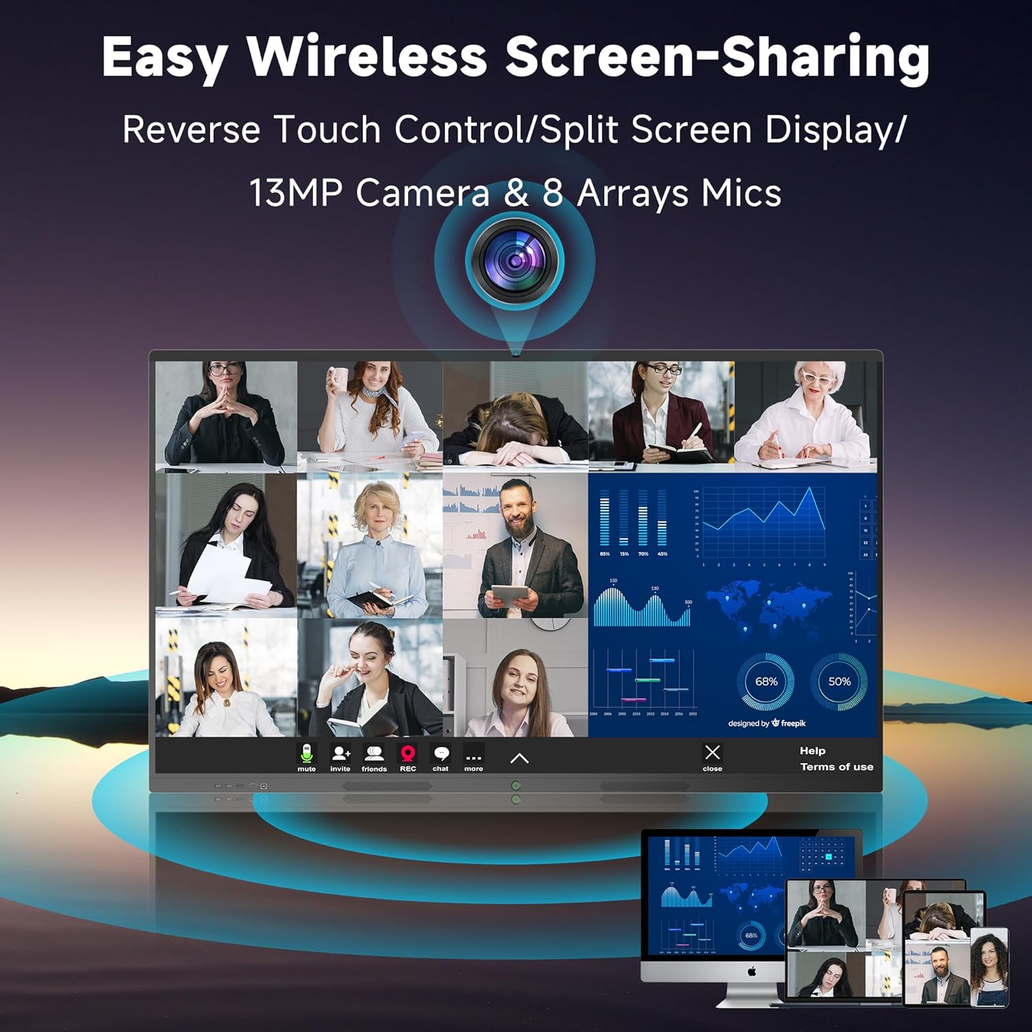 - 【Seamless Information Sharing】: Digital Presentation Electronic Smart WhiteBoard facilitate seamless information sharing by allowing users to wirelessly connect their devices to the board, share content, and collaborate in real-time, enhancing productivity and communication. smart board supports up to 4 users to Wireless screen projection, or by connecting in ports.