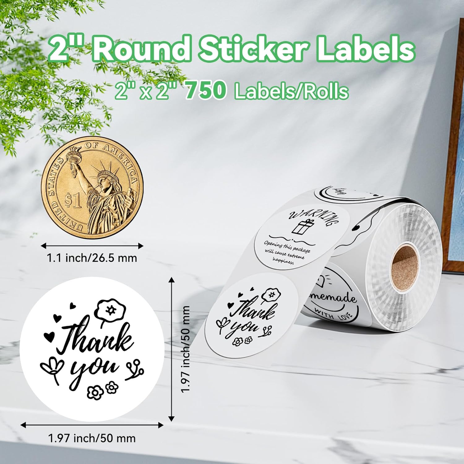 2'' White Round Thermal Labels, 750pcs Circle Thermal Printer Label, Multi-Purpose for DIY Logo Design, Name/Price Tag, Address, QR Code, 750 Labels/Roll