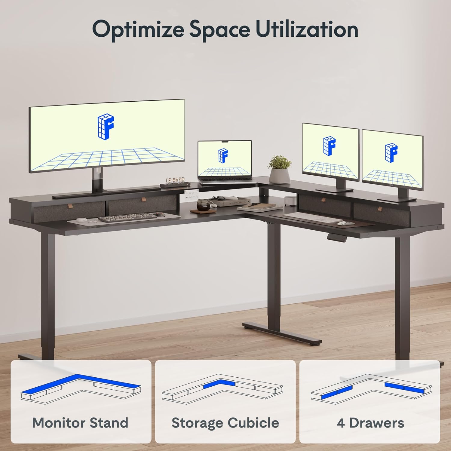 FLEXISPOT 63" L Shaped Standing Desk Electric Corner Table with Monitor Shelf, 4 Storage Drawers, Adjustable Computer Workstation for Home, Office, Game, Studio, Black Top + Black Frame