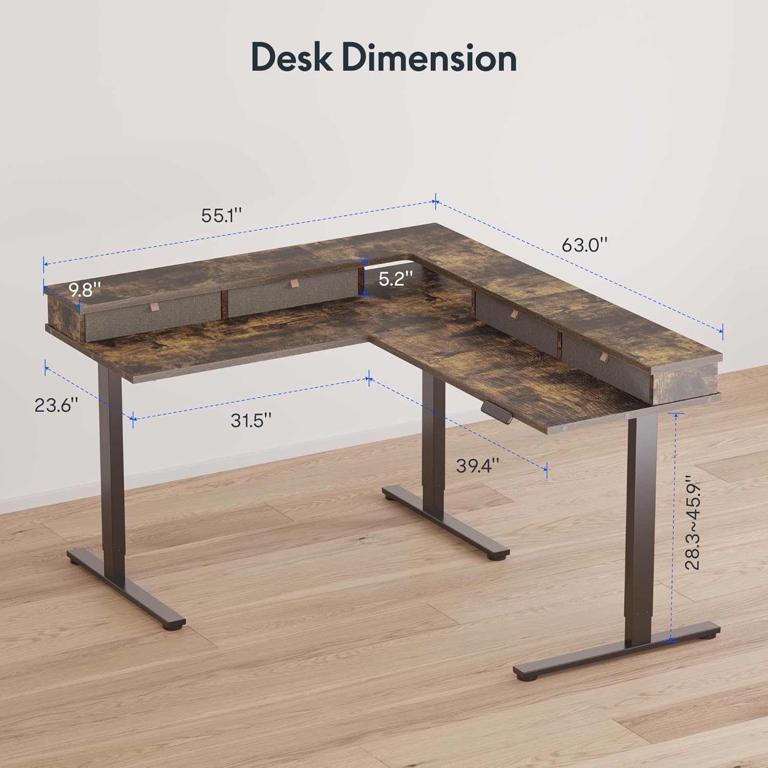 FLEXISPOT 63" L Shaped Standing Desk Electric Corner Table with Shelf, 4 Storage Drawers, Adjustable Computer Workstation for Home, Office, Game, Studio, Rustic Brown Top + Black Frame