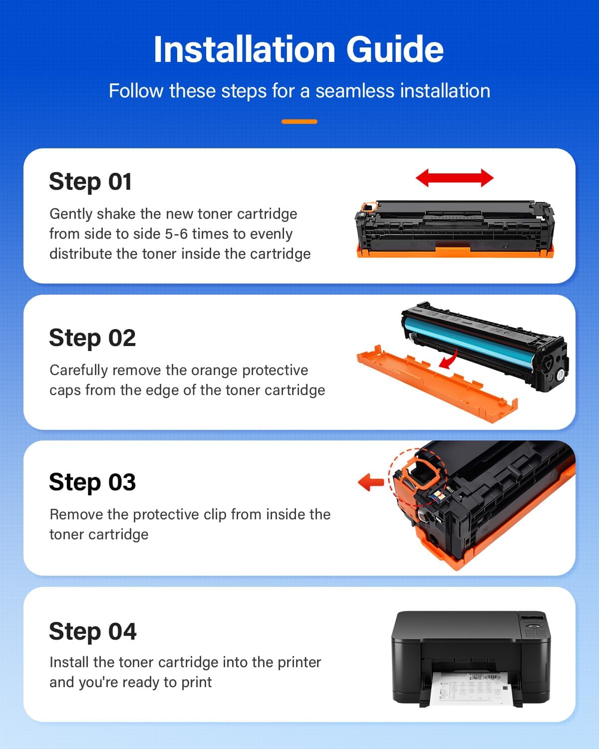 - Total Packges: 4-Pack of 131A Toner Cartridges, Black for CF210A,Cyan for CF211A,Yellow for CF212A,Magenta for CF213A.