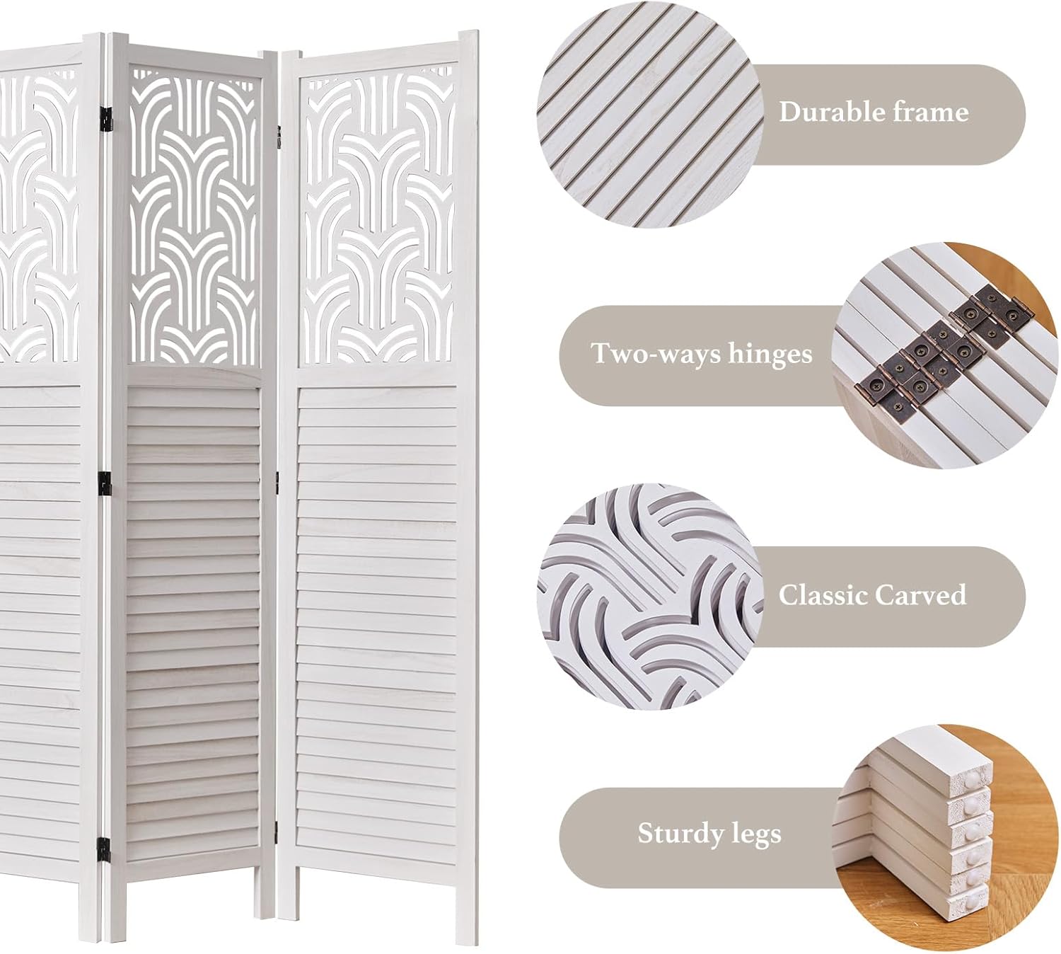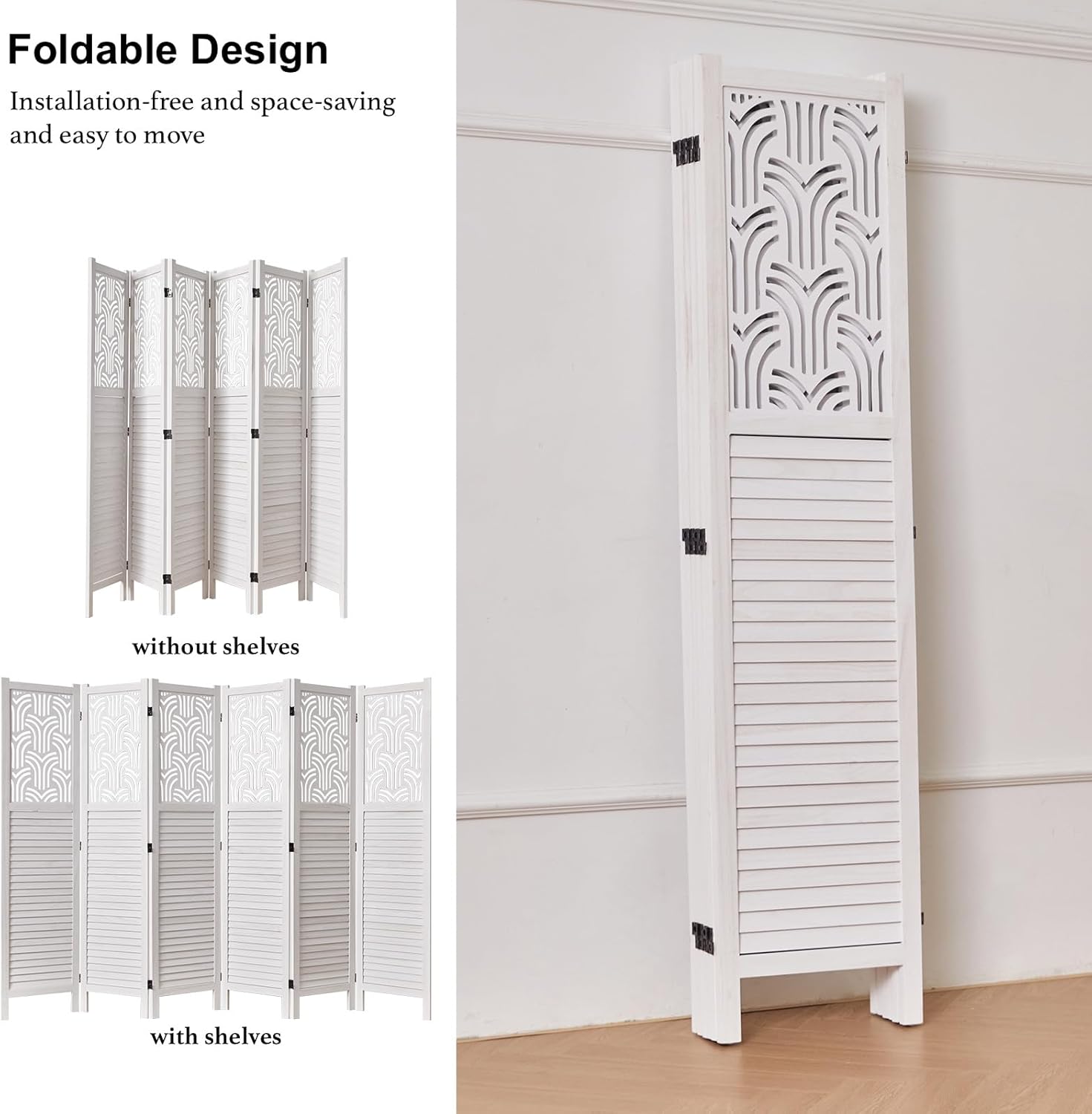 Folding Room Divider, 66.9 Inch 6 Panels Wood Carved Privacy Screens, Free Assembled Freestanding Portable Separation Wall for Home Office Restaurant Bedroom (White)