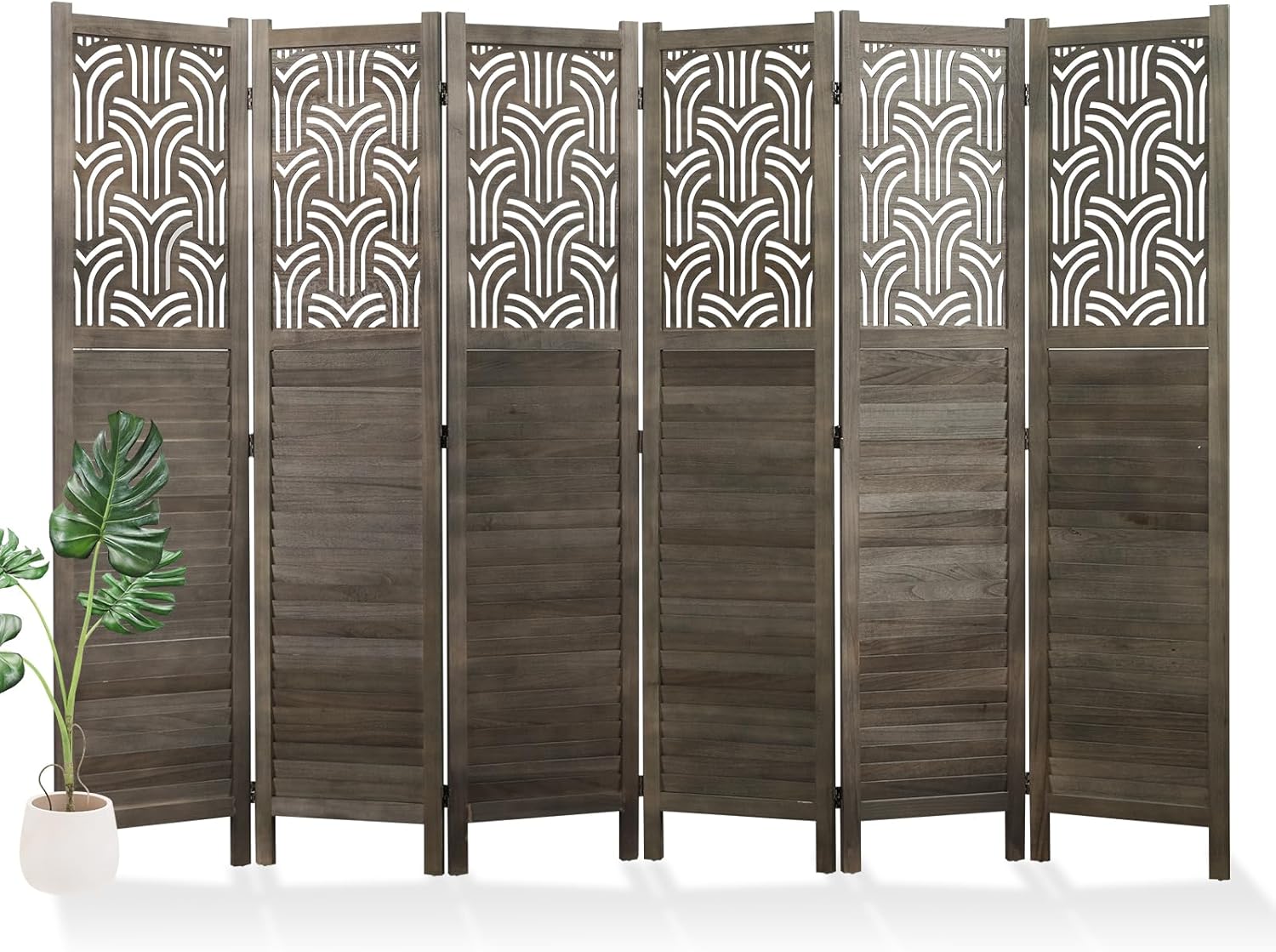 Folding Room Divider, 66.9 Inch 6 Panels Wood Carved Privacy Screens, Free Assembled Freestanding Portable Separation Wall for Home Office Restaurant Bedroom (Gray)