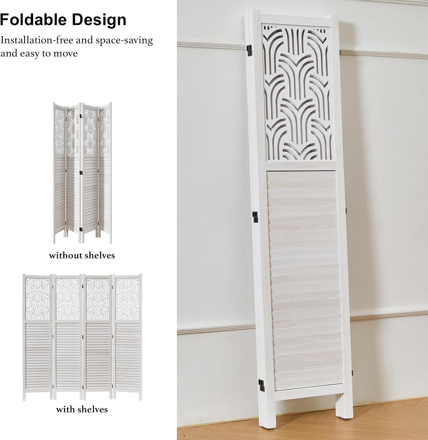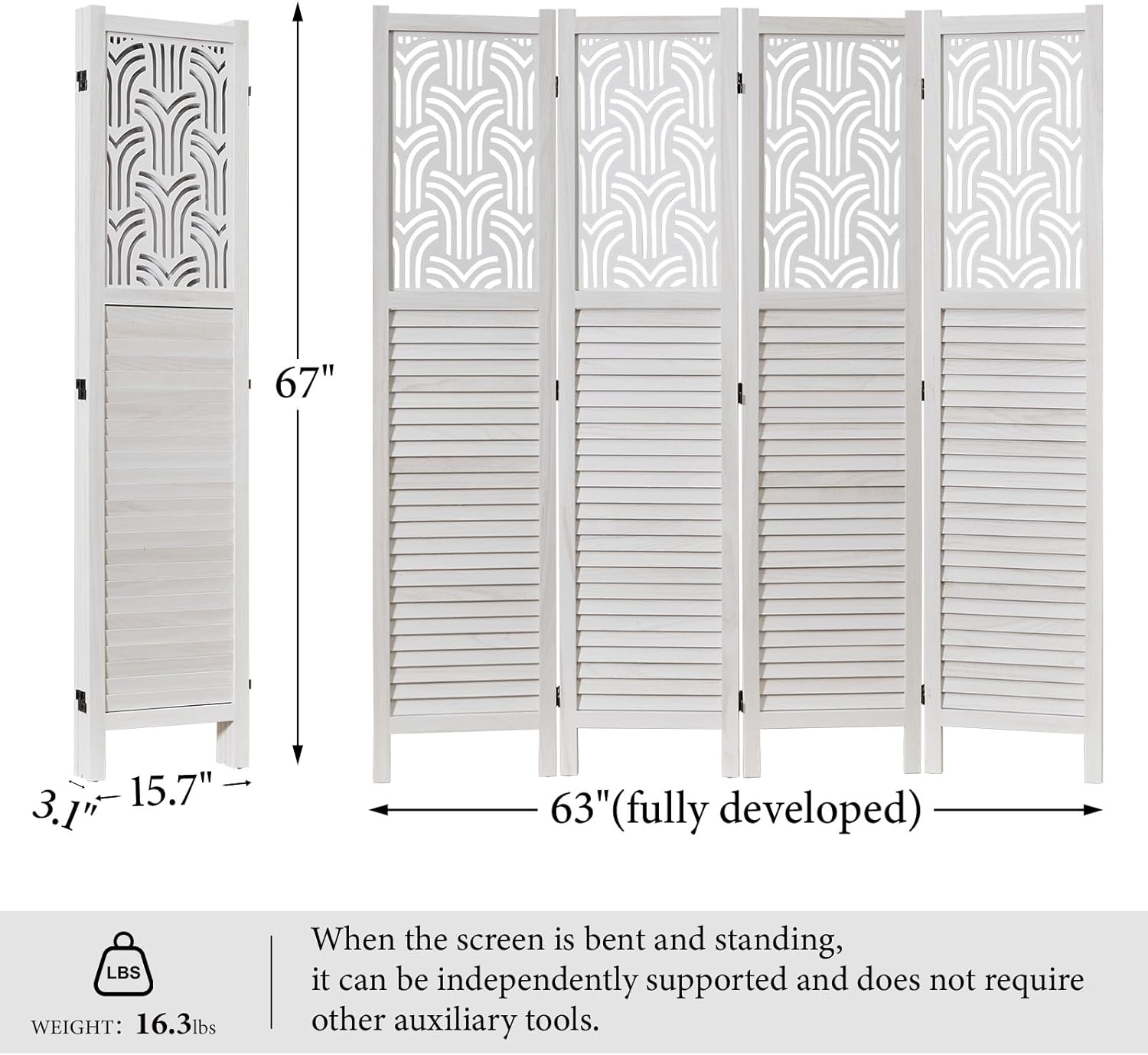 Folding Room Divider, 66.9 Inch 4 Panels Wood Carved Privacy Screens, Free Assembled Freestanding Portable Separation Wall for Home Office Restaurant Bedroom (White)