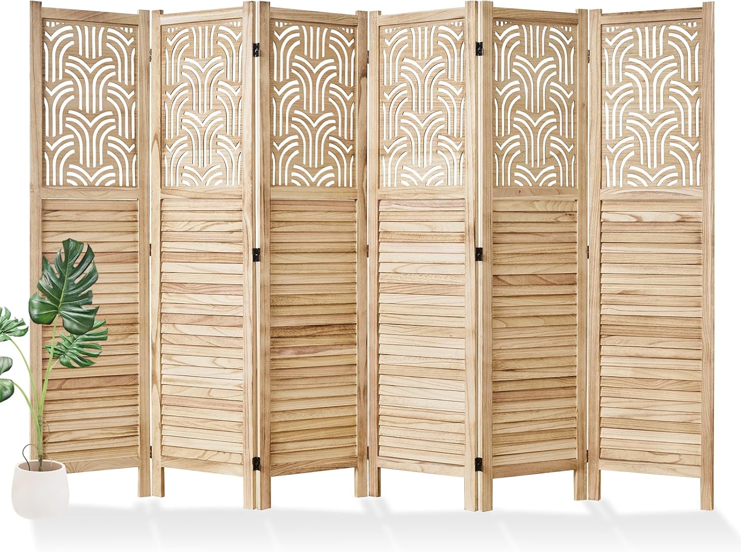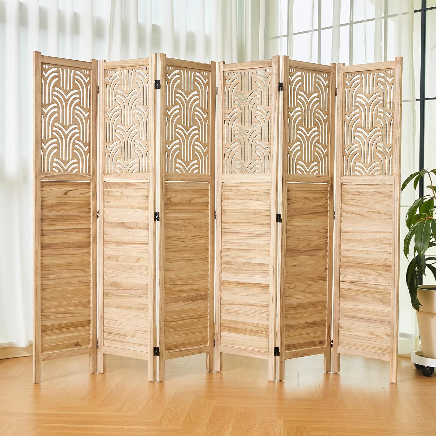 Folding Room Divider, 66.9 Inch 6 Panels Wood Carved Privacy Screens, Free Assembled Freestanding Portable Separation Wall for Home Office Bedroom (Natural)