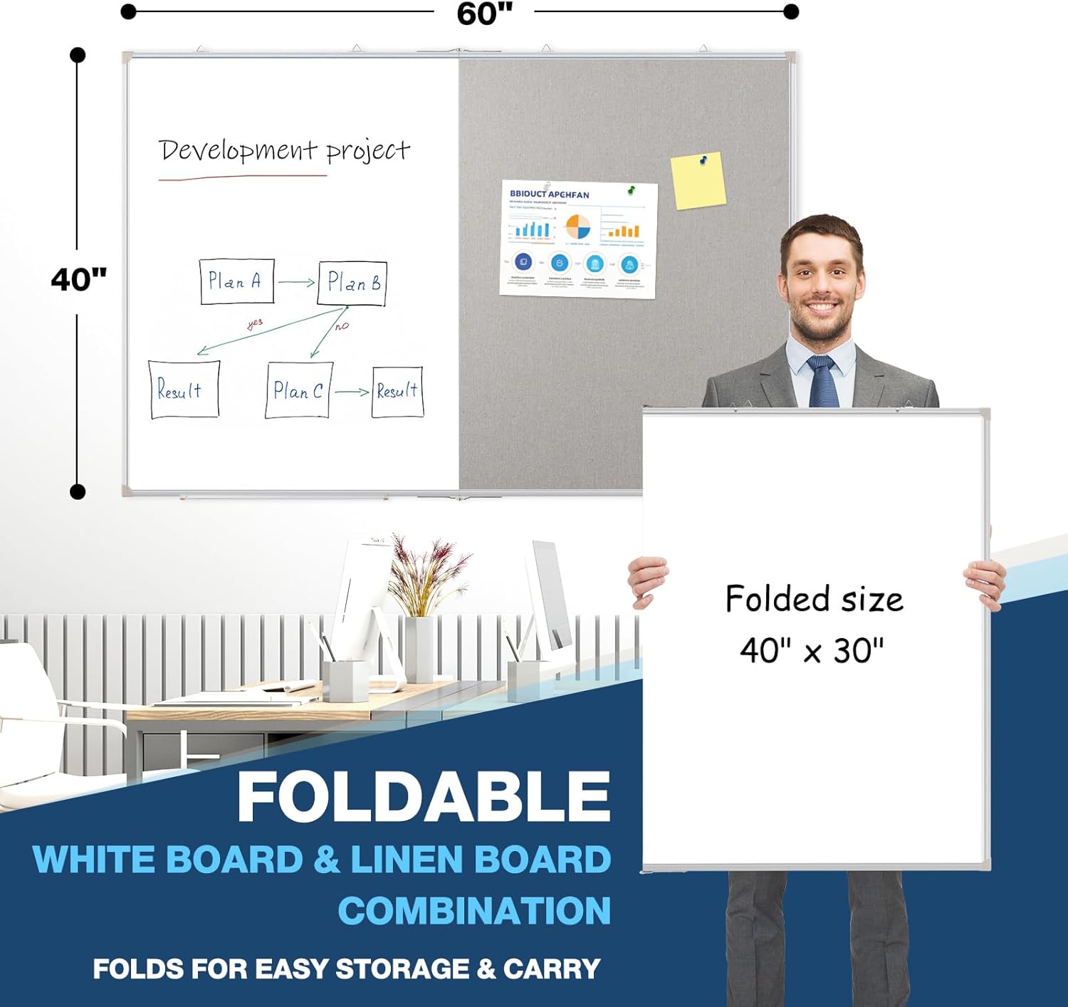Large White Board Dry Erase Foldable Bulletin Board Combo, 60" x 40" Double Sided Dry Erase Board for Wall, Magnetic Whiteboard Bulletin Board with Linen for Office, Home, School, Kitchen -Gray
