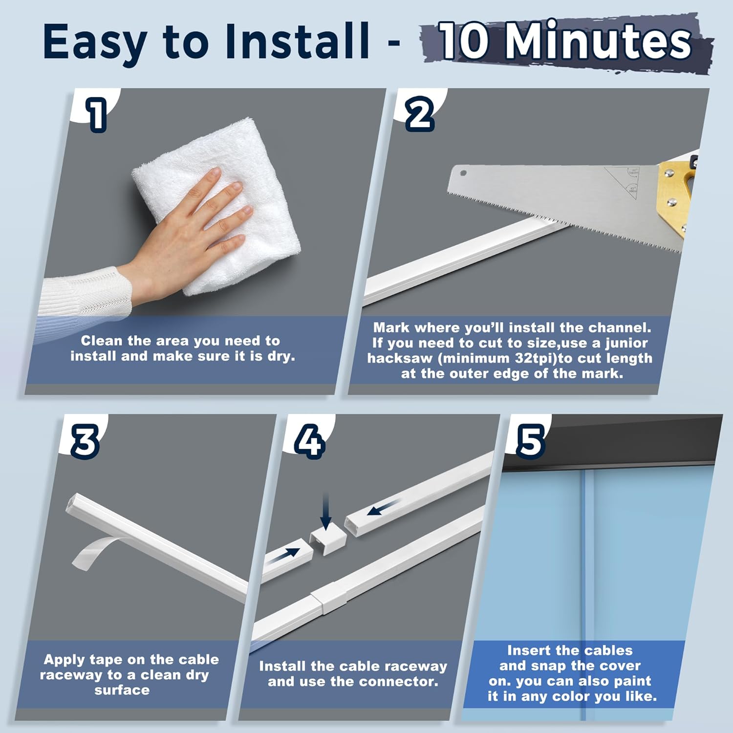 - Quick and Easy: Simply plan your route, apply the tape, and install the cable channels. The snap-in and sliding design allows for easy addition or removal of cables after installation, while the included accessories add a sleek, modern touch