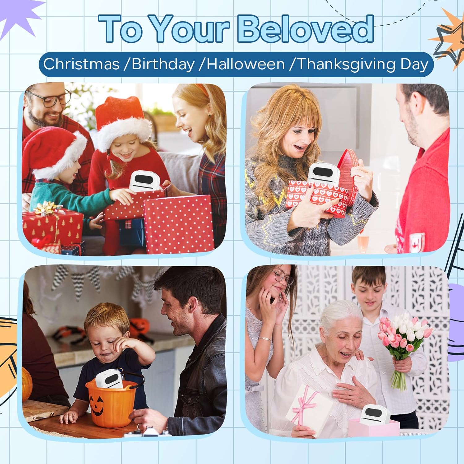 - Custom Label Maker: This small portable printer is suitable for use with family and friends during Halloween, Thanksgiving, birthdays, and other holidays. Also you can DIY design patterns and cut out various shapes to meet your needs