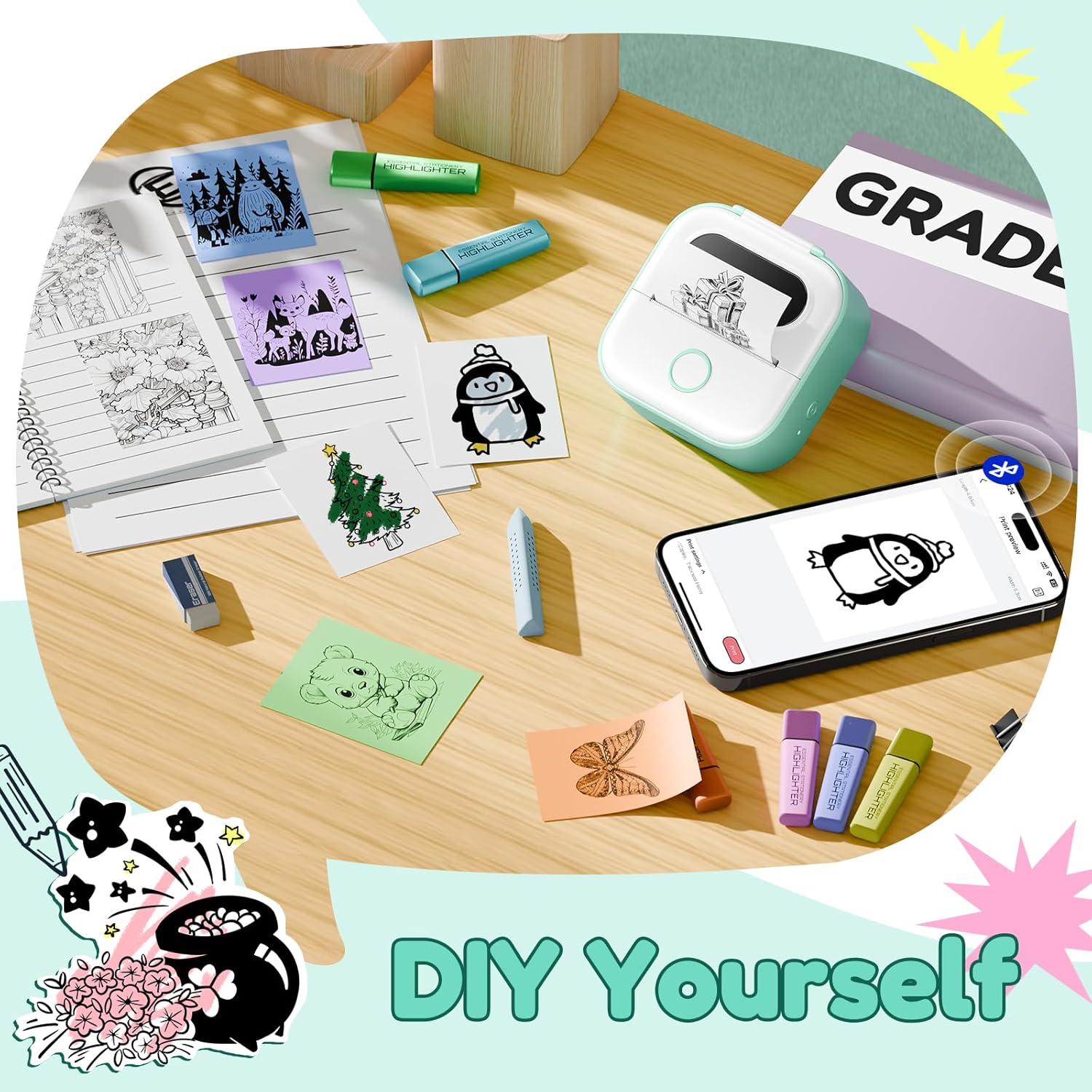 - Multi-functional thermal mini printer: The Y02C sticky note printer is suitable for use in the office, DIY projects, home, and study. In the workplace, it can be used for to-do lists, memos, addresses, receipts, and in daily life, it can be used for bookmarks, greeting cards, label recognition, coloring, letter learning, and card recognition, among other purposes
