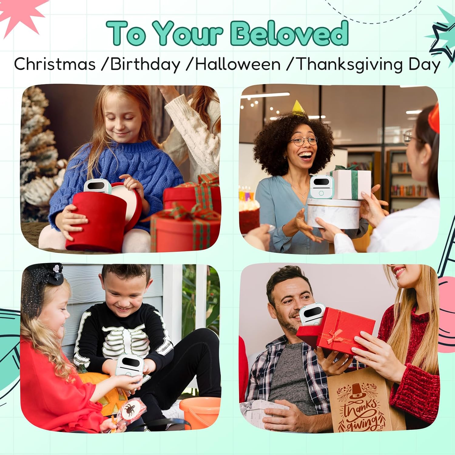 - Custom Label Maker: This small portable printer is suitable for use with family and friends during Halloween, Thanksgiving, birthdays, and other holidays. Also you can DIY design patterns and cut out various shapes to meet your needs