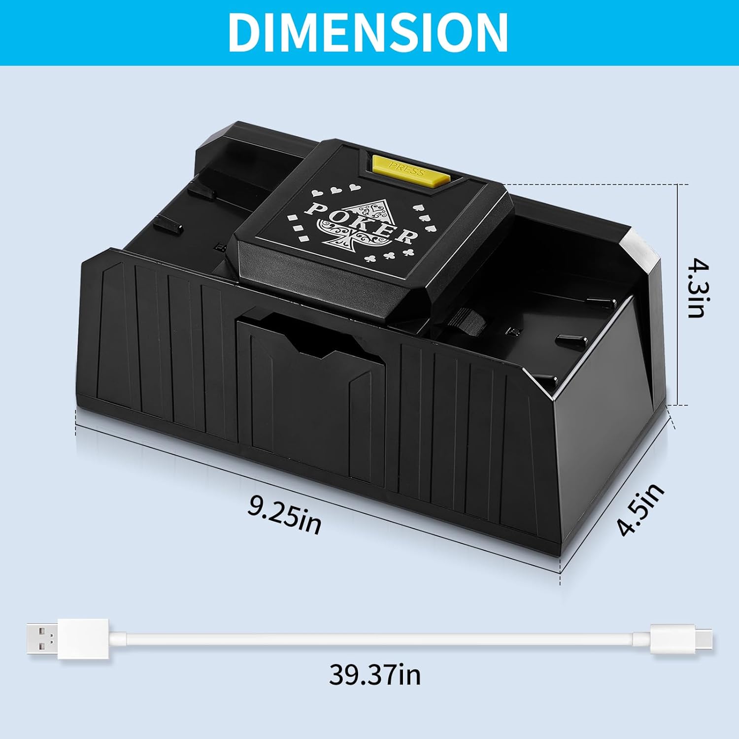 - Universal Card Fit for All Your Games: Designed to accommodate a wide range of card sizes (up to 3.81" L x 2.67" W). Perfectly shuffles popular games like Poker (Texas Hold 'em), Blackjack, Bridge, Uno, Phase 10, Skip-Bo, Five Crowns, Hand and Foot, and many more.Unit dimensions: 9.25" L x 4.5" W x 4.3" H.