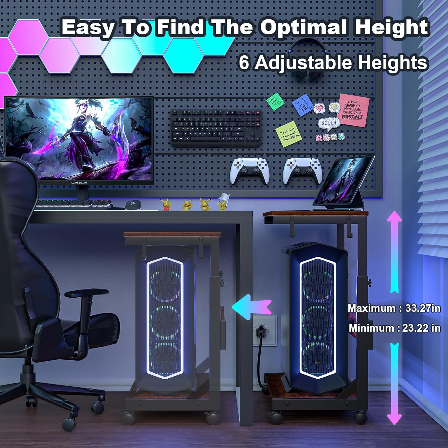 - Height Adjustable Pc Tower Stand: Features unique manual height adjustment ranging from 23.23"-33.27" to speed up heat dissipation and improve overall computer performance, overall dimensions 25.19 inches long, 13.78 inches wide, Allows you to store the tower under or next to a desk, Supports most computer towers on the market including full-tower ATX case