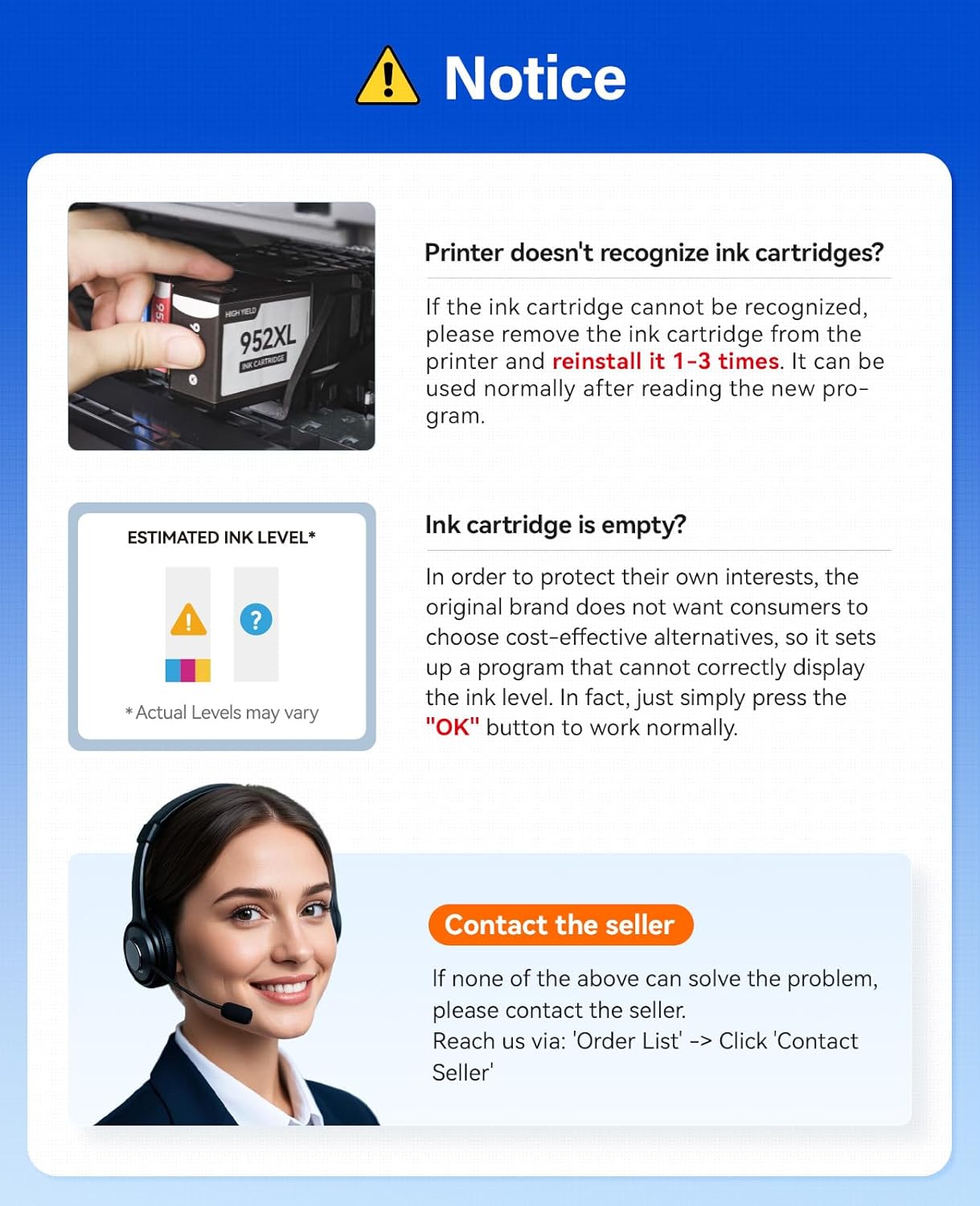 - 952XL Ink Cartridges Combo Pack: KingKJ for HP 952 ink cartridges are easy for installation, Equipped with upgarded chip. Faulty cartridges can be replaced for free!